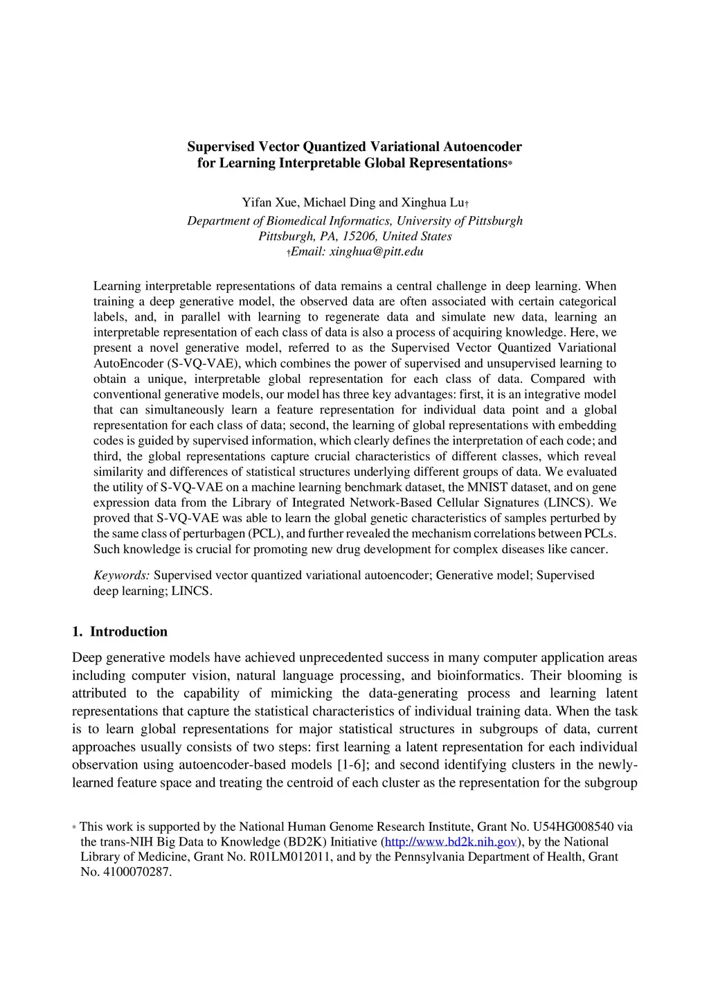 Learning interpretable representations of data remains a central challenge in deep learning. When training a deep generative model, the observed data are often associated with certain categorical labels, and, in parallel with learning to regenerate data and simulate new data, learning an interpretable representation of each class of data is also a process of acquiring knowledge. Here, we present a novel generative model, referred to as the Supervised Vector Quantized Variational AutoEncoder (S-VQ-VAE), which combines the power of supervised and unsupervised learning to obtain a unique, interpretable global representation for each class of data. Compared with conventional generative models, our model has three key advantages: first, it is an integrative model that can simultaneously learn a feature representation for individual data point and a global representation for each class of data; second, the learning of global representations with embedding codes is guided by supervised information, which clearly defines the interpretation of each code; and third, the global representations capture crucial characteristics of different classes, which reveal similarity and differences of statistical structures underlying different groups of data. We evaluated the utility of S-VQ-VAE on a machine learning benchmark dataset, the MNIST dataset, and on gene expression data from the Library of Integrated Network-Based Cellular Signatures (LINCS). We proved that S-VQ-VAE was able to learn the global genetic characteristics of samples perturbed by the same class of perturbagen (PCL), and further revealed the mechanism correlations between PCLs. Such knowledge is crucial for promoting new drug development for complex diseases like cancer.