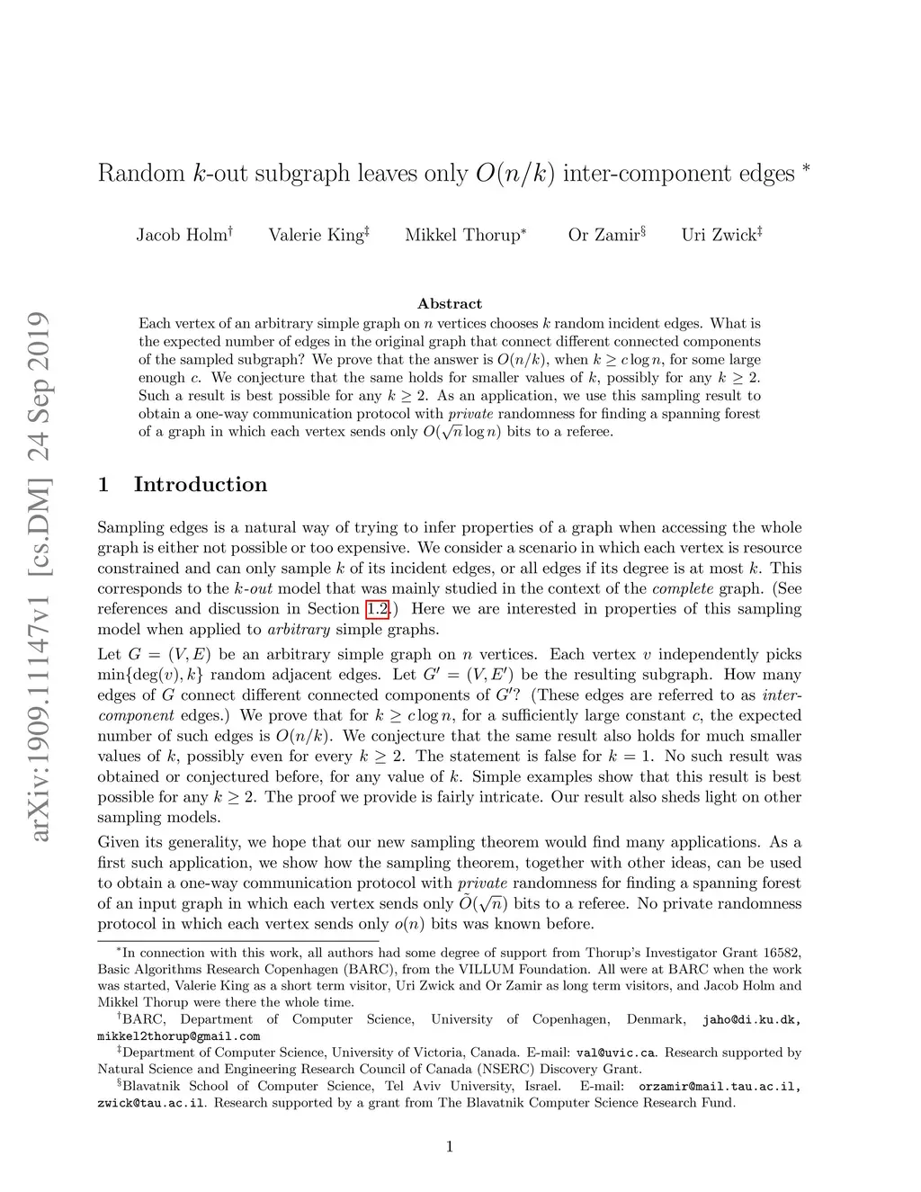 Random -out subgraph leaves only inter-component edges