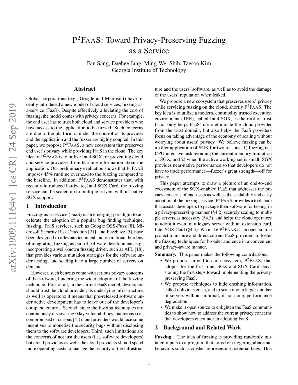 Global corporations (e.g., Google and Microsoft) have recently introduced a new model of cloud services, fuzzing-as-a-service (FaaS). Despite effectively alleviating the cost of fuzzing, the model comes with privacy concerns. For example, the end user has to trust both cloud and service providers who have access to the application to be fuzzed. Such concerns are due to the platform is under the control of its provider and the application and the fuzzer are highly coupled. In this paper, we propose P2FaaS, a new ecosystem that preserves end user's privacy while providing FaaS in the cloud. The key idea of P2FaaS is to utilize Intel SGX for preventing cloud and service providers from learning information about the application. Our preliminary evaluation shows that P2FaaS imposes 45% runtime overhead to the fuzzing compared to the baseline. In addition, P2FaaS demonstrates that, with recently introduced hardware, Intel SGX Card, the fuzzing service can be scaled up to multiple servers without native SGX support.
