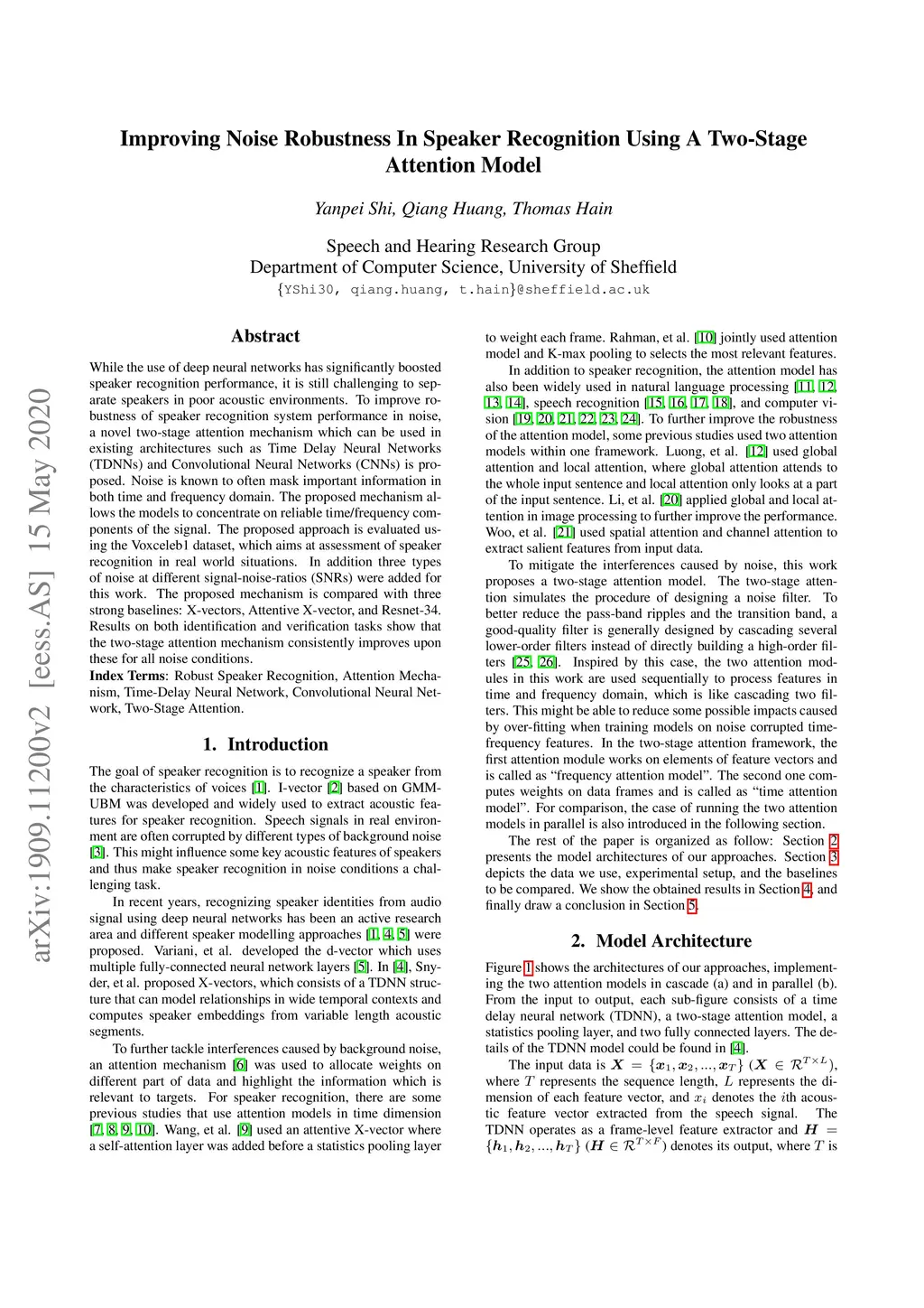 While the use of deep neural networks has significantly boosted speaker recognition performance, it is still challenging to separate speakers in poor acoustic environments. To improve robustness of speaker recognition system performance in noise, a novel two-stage attention mechanism which can be used in existing architectures such as Time Delay Neural Networks (TDNNs) and Convolutional Neural Networks (CNNs) is proposed. Noise is known to often mask important information in both time and frequency domain. The proposed mechanism allows the models to concentrate on reliable time/frequency components of the signal. The proposed approach is evaluated using the Voxceleb1 dataset, which aims at assessment of speaker recognition in real world situations. In addition three types of noise at different signal-noise-ratios (SNRs) were added for this work. The proposed mechanism is compared with three strong baselines: X-vectors, Attentive X-vector, and Resnet-34. Results on both identification and verification tasks show that the two-stage attention mechanism consistently improves upon these for all noise conditions.