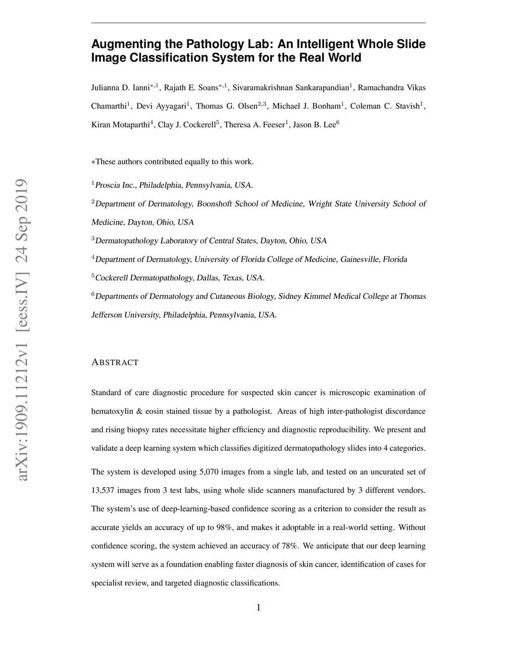 Standard of care diagnostic procedure for suspected skin cancer is microscopic examination of hematoxylin \& eosin stained tissue by a pathologist. Areas of high inter-pathologist discordance and rising biopsy rates necessitate higher efficiency and diagnostic reproducibility. We present and validate a deep learning system which classifies digitized dermatopathology slides into 4 categories. The system is developed using 5,070 images from a single lab, and tested on an uncurated set of 13,537 images from 3 test labs, using whole slide scanners manufactured by 3 different vendors. The system's use of deep-learning-based confidence scoring as a criterion to consider the result as accurate yields an accuracy of up to 98\%, and makes it adoptable in a real-world setting. Without confidence scoring, the system achieved an accuracy of 78\%. We anticipate that our deep learning system will serve as a foundation enabling faster diagnosis of skin cancer, identification of cases for specialist review, and targeted diagnostic classifications.