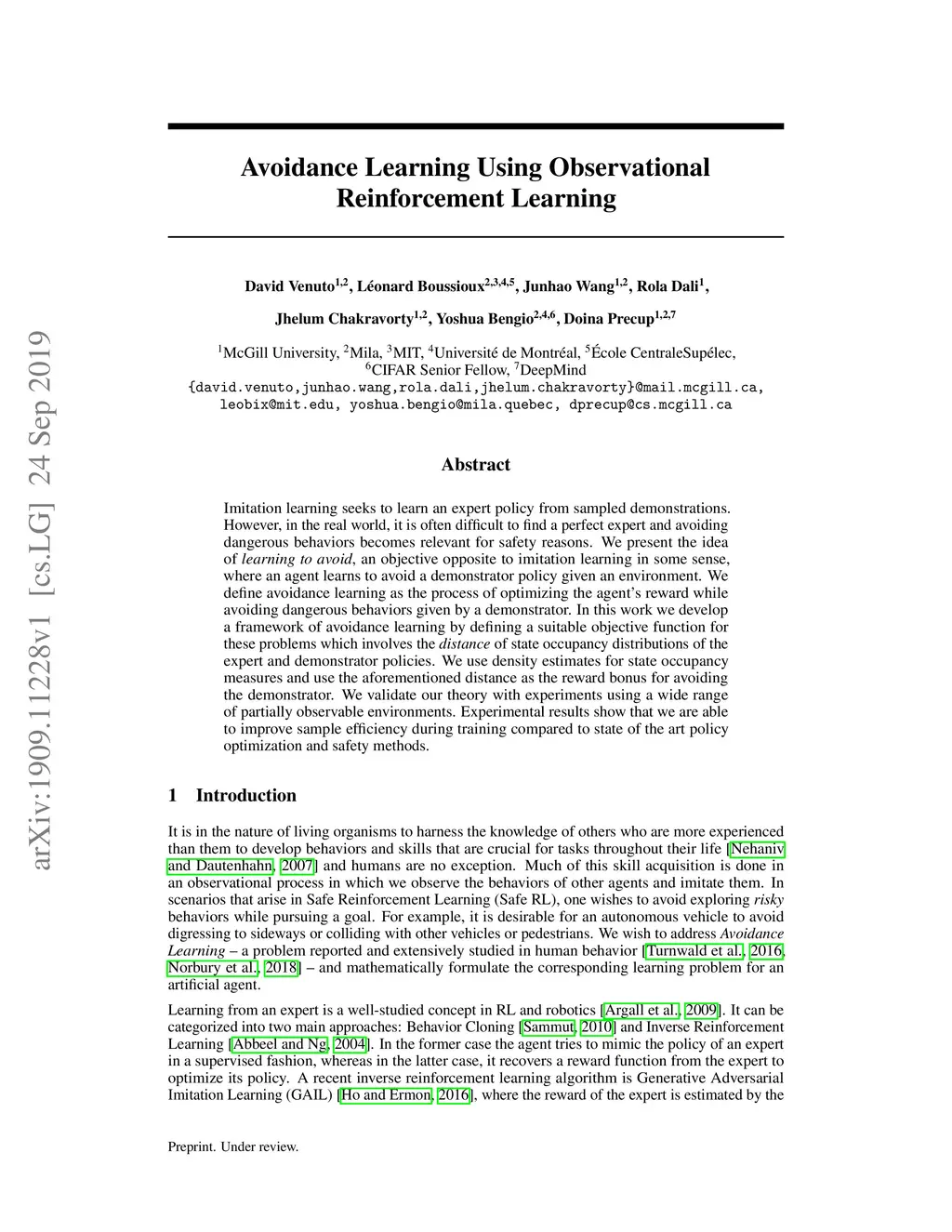Avoidance Learning Using Observational Reinforcement Learning