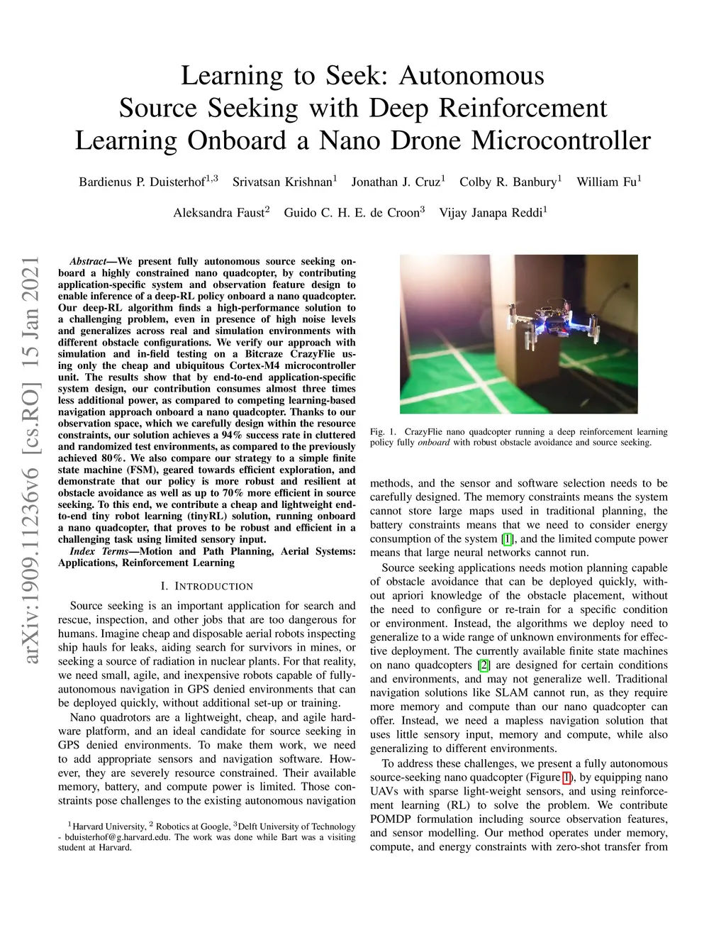 We present fully autonomous source seeking onboard a highly constrained nano quadcopter, by contributing application-specific system and observation feature design to enable inference of a deep-RL policy onboard a nano quadcopter. Our deep-RL algorithm finds a high-performance solution to a challenging problem, even in presence of high noise levels and generalizes across real and simulation environments with different obstacle configurations. We verify our approach with simulation and in-field testing on a Bitcraze CrazyFlie using only the cheap and ubiquitous Cortex-M4 microcontroller unit. The results show that by end-to-end application-specific system design, our contribution consumes almost three times less additional power, as compared to competing learning-based navigation approach onboard a nano quadcopter. Thanks to our observation space, which we carefully design within the resource constraints, our solution achieves a 94% success rate in cluttered and randomized test environments, as compared to the previously achieved 80%. We also compare our strategy to a simple finite state machine (FSM), geared towards efficient exploration, and demonstrate that our policy is more robust and resilient at obstacle avoidance as well as up to 70% more efficient in source seeking. To this end, we contribute a cheap and lightweight end-to-end tiny robot learning (tinyRL) solution, running onboard a nano quadcopter, that proves to be robust and efficient in a challenging task using limited sensory input.