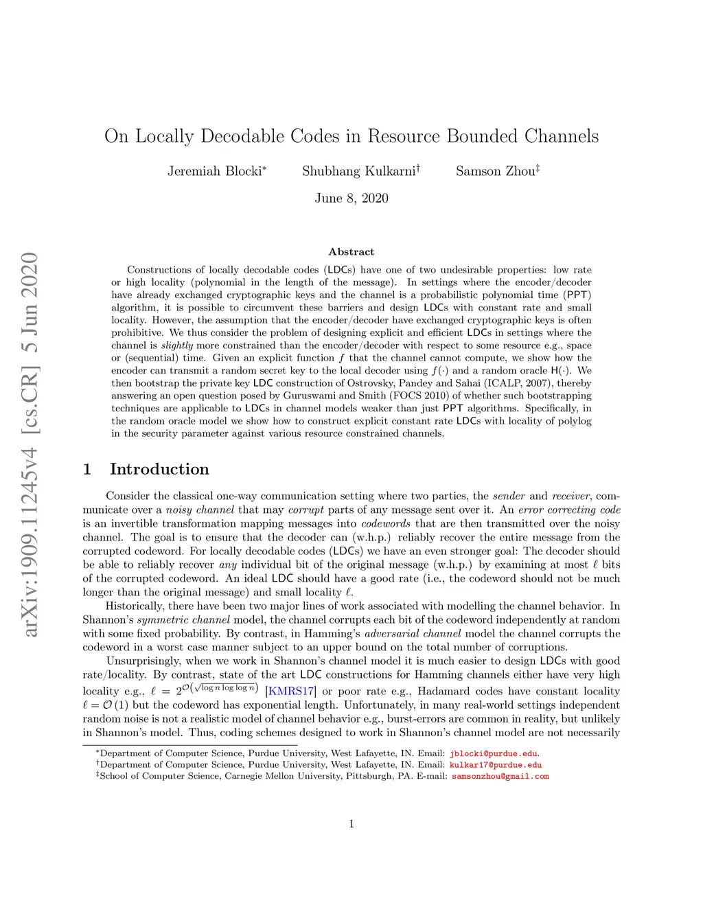 Constructions of locally decodable codes (LDCs) have one of two undesirable properties: low rate or high locality (polynomial in the length of the message). In settings where the encoder/decoder have already exchanged cryptographic keys and the channel is a probabilistic polynomial time (PPT) algorithm, it is possible to circumvent these barriers and design LDCs with constant rate and small locality. However, the assumption that the encoder/decoder have exchanged cryptographic keys is often prohibitive. We thus consider the problem of designing explicit and efficient LDCs in settings where the channel is slightly more constrained than the encoder/decoder with respect to some resource e.g., space or (sequential) time. Given an explicit function that the channel cannot compute, we show how the encoder can transmit a random secret key to the local decoder using and a random oracle . This allows bootstrap from the private key LDC construction of Ostrovsky, Pandey and Sahai (ICALP, 2007), thereby answering an open question posed by Guruswami and Smith (FOCS 2010) of whether such bootstrapping techniques may apply to LDCs in weaker channel models than just PPT algorithms. Specifically, in the random oracle model we show how to construct explicit constant rate LDCs with locality of polylog in the security parameter against various resource constrained channels.