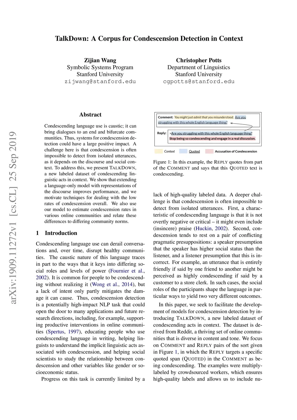 TalkDown: A Corpus for Condescension Detection in Context