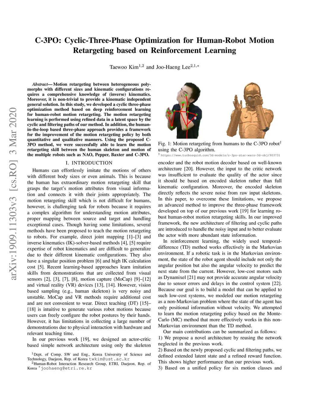 Motion retargeting between heterogeneous polymorphs with different sizes and kinematic configurations requires a comprehensive knowledge of (inverse) kinematics. Moreover, it is non-trivial to provide a kinematic independent general solution. In this study, we developed a cyclic three-phase optimization method based on deep reinforcement learning for human-robot motion retargeting. The motion retargeting learning is performed using refined data in a latent space by the cyclic and filtering paths of our method. In addition, the human-in-the-loop based three-phase approach provides a framework for the improvement of the motion retargeting policy by both quantitative and qualitative manners. Using the proposed C-3PO method, we were successfully able to learn the motion retargeting skill between the human skeleton and motion of the multiple robots such as NAO, Pepper, Baxter and C-3PO.