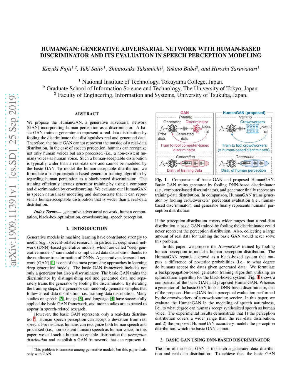 We propose the HumanGAN, a generative adversarial network (GAN) incorporating human perception as a discriminator. A basic GAN trains a generator to represent a real-data distribution by fooling the discriminator that distinguishes real and generated data. Therefore, the basic GAN cannot represent the outside of a real-data distribution. In the case of speech perception, humans can recognize not only human voices but also processed (i.e., a non-existent human) voices as human voice. Such a human-acceptable distribution is typically wider than a real-data one and cannot be modeled by the basic GAN. To model the human-acceptable distribution, we formulate a backpropagation-based generator training algorithm by regarding human perception as a black-boxed discriminator. The training efficiently iterates generator training by using a computer and discrimination by crowdsourcing. We evaluate our HumanGAN in speech naturalness modeling and demonstrate that it can represent a human-acceptable distribution that is wider than a real-data distribution.