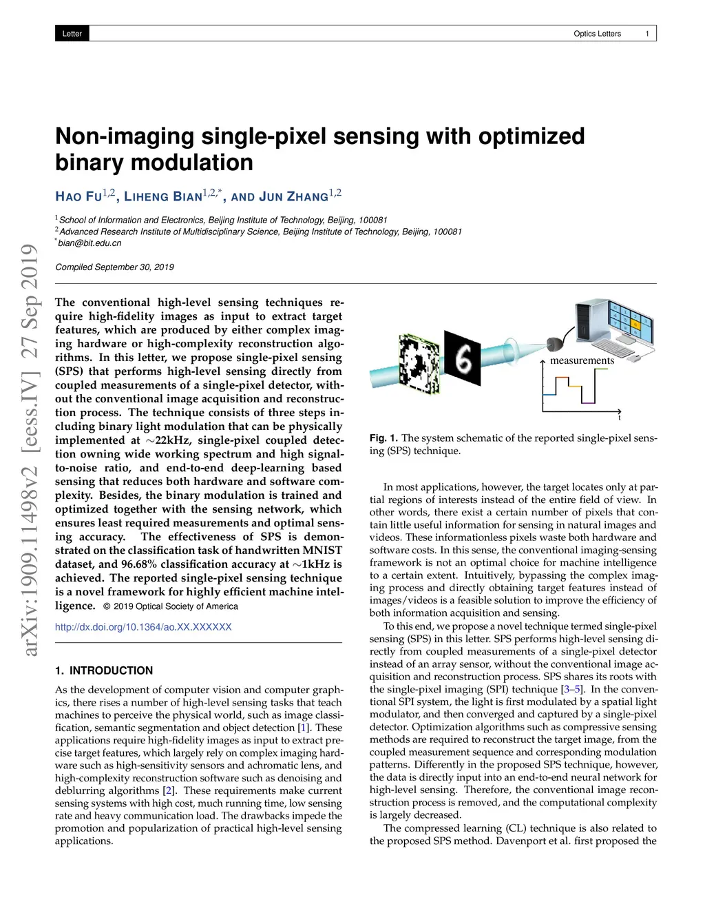 The conventional high-level sensing techniques require high-fidelity images as input to extract target features, which are produced by either complex imaging hardware or high-complexity reconstruction algorithms. In this letter, we propose single-pixel sensing (SPS) that performs high-level sensing directly from coupled measurements of a single-pixel detector, without the conventional image acquisition and reconstruction process. The technique consists of three steps including binary light modulation that can be physically implemented at 22kHz, single-pixel coupled detection owning wide working spectrum and high signal-to-noise ratio, and end-to-end deep-learning based sensing that reduces both hardware and software complexity. Besides, the binary modulation is trained and optimized together with the sensing network, which ensures least required measurements and optimal sensing accuracy. The effectiveness of SPS is demonstrated on the classification task of handwritten MNIST dataset, and 96.68% classification accuracy at 1kHz is achieved. The reported single-pixel sensing technique is a novel framework for highly efficient machine intelligence.