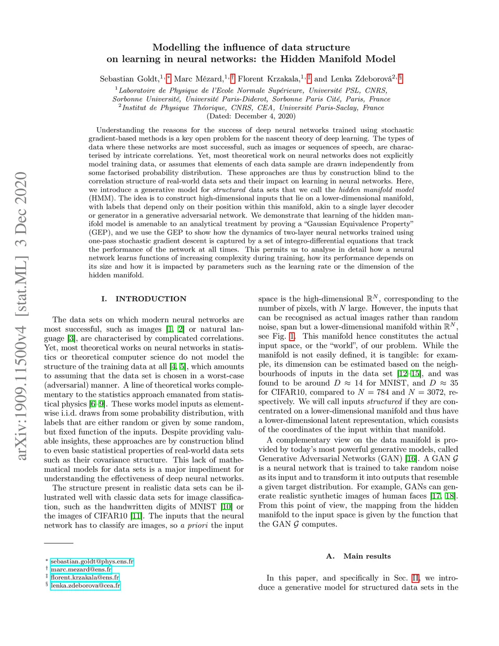 Understanding the reasons for the success of deep neural networks trained using stochastic gradient-based methods is a key open problem for the nascent theory of deep learning. The types of data where these networks are most successful, such as images or sequences of speech, are characterised by intricate correlations. Yet, most theoretical work on neural networks does not explicitly model training data, or assumes that elements of each data sample are drawn independently from some factorised probability distribution. These approaches are thus by construction blind to the correlation structure of real-world data sets and their impact on learning in neural networks. Here, we introduce a generative model for structured data sets that we call the hidden manifold model (HMM). The idea is to construct high-dimensional inputs that lie on a lower-dimensional manifold, with labels that depend only on their position within this manifold, akin to a single layer decoder or generator in a generative adversarial network. We demonstrate that learning of the hidden manifold model is amenable to an analytical treatment by proving a "Gaussian Equivalence Property" (GEP), and we use the GEP to show how the dynamics of two-layer neural networks trained using one-pass stochastic gradient descent is captured by a set of integro-differential equations that track the performance of the network at all times. This permits us to analyse in detail how a neural network learns functions of increasing complexity during training, how its performance depends on its size and how it is impacted by parameters such as the learning rate or the dimension of the hidden manifold.