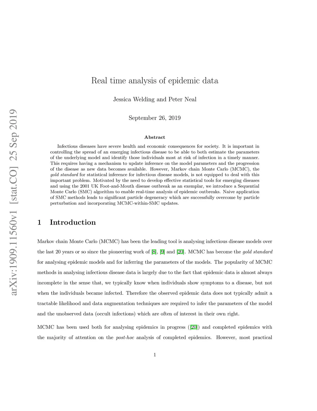 Infectious diseases have severe health and economic consequences for society. It is important in controlling the spread of an emerging infectious disease to be able to both estimate the parameters of the underlying model and identify those individuals most at risk of infection in a timely manner. This requires having a mechanism to update inference on the model parameters and the progression of the disease as new data becomes available. However, Markov chain Monte Carlo (MCMC), the gold standard for statistical inference for infectious disease models, is not equipped to deal with this important problem. Motivated by the need to develop effective statistical tools for emerging diseases and using the 2001 UK Foot-and-Mouth disease outbreak as an exemplar, we introduce a Sequential Monte Carlo (SMC) algorithm to enable real-time analysis of epidemic outbreaks. Naive application of SMC methods leads to significant particle degeneracy which are successfully overcome by particle perturbation and incorporating MCMC-within-SMC updates.
