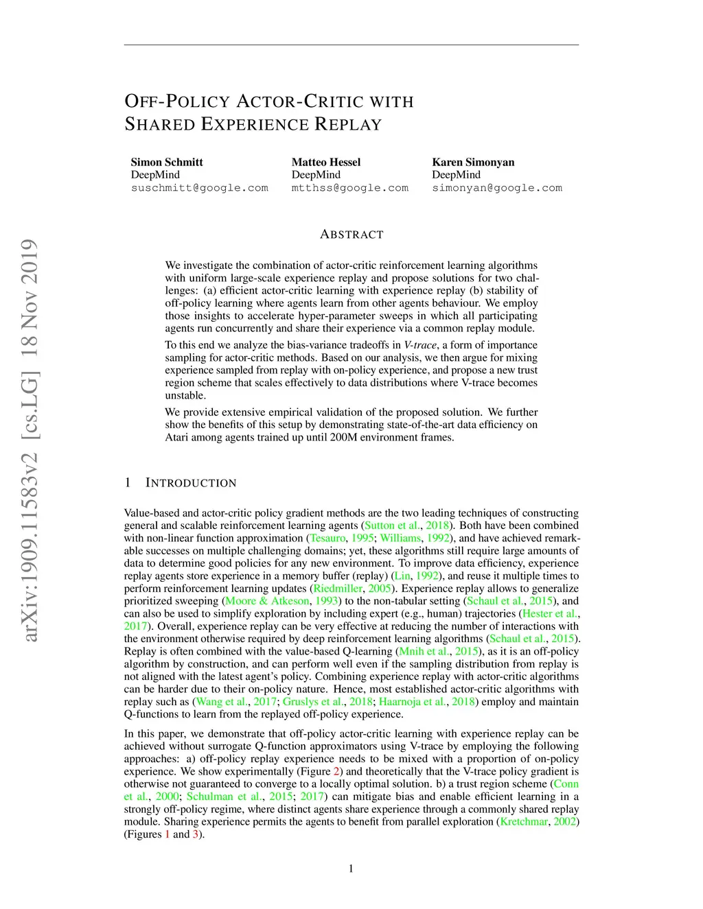 We investigate the combination of actor-critic reinforcement learning algorithms with uniform large-scale experience replay and propose solutions for two challenges: (a) efficient actor-critic learning with experience replay (b) stability of off-policy learning where agents learn from other agents behaviour. We employ those insights to accelerate hyper-parameter sweeps in which all participating agents run concurrently and share their experience via a common replay module. To this end we analyze the bias-variance tradeoffs in V-trace, a form of importance sampling for actor-critic methods. Based on our analysis, we then argue for mixing experience sampled from replay with on-policy experience, and propose a new trust region scheme that scales effectively to data distributions where V-trace becomes unstable. We provide extensive empirical validation of the proposed solution. We further show the benefits of this setup by demonstrating state-of-the-art data efficiency on Atari among agents trained up until 200M environment frames.
