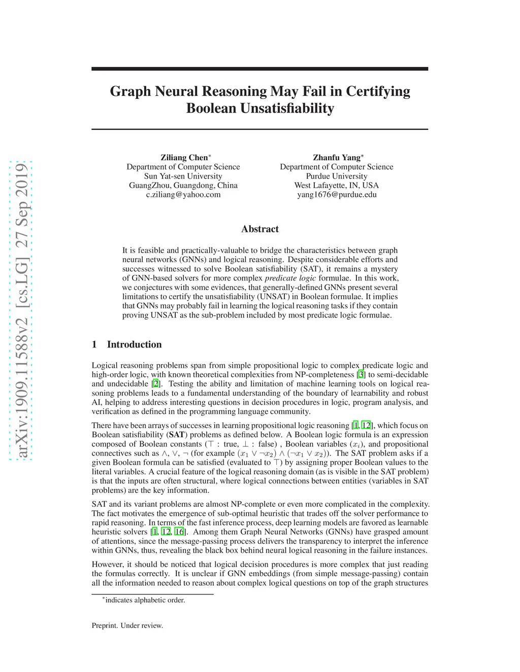 It is feasible and practically-valuable to bridge the characteristics between graph neural networks (GNNs) and logical reasoning. Despite considerable efforts and successes witnessed to solve Boolean satisfiability (SAT), it remains a mystery of GNN-based solvers for more complex predicate logic formulae. In this work, we conjectures with some evidences, that generally-defined GNNs present several limitations to certify the unsatisfiability (UNSAT) in Boolean formulae. It implies that GNNs may probably fail in learning the logical reasoning tasks if they contain proving UNSAT as the sub-problem included by most predicate logic formulae.