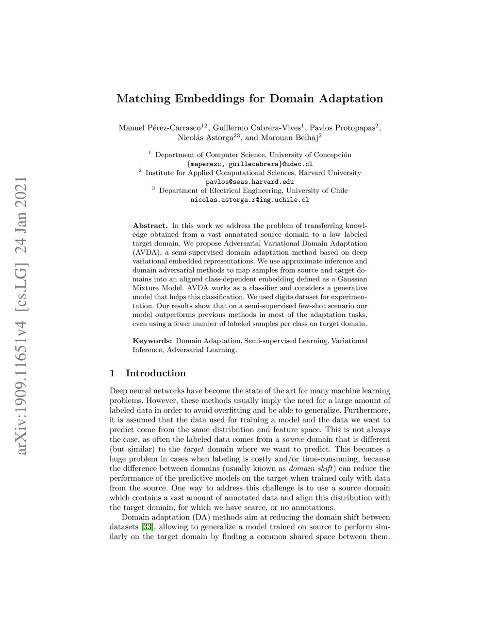 In this work we address the problem of transferring knowledge obtained from a vast annotated source domain to a low labeled target domain. We propose Adversarial Variational Domain Adaptation (AVDA), a semi-supervised domain adaptation method based on deep variational embedded representations. We use approximate inference and domain adversarial methods to map samples from source and target domains into an aligned class-dependent embedding defined as a Gaussian Mixture Model. AVDA works as a classifier and considers a generative model that helps this classification. We used digits dataset for experimentation. Our results show that on a semi-supervised few-shot scenario our model outperforms previous methods in most of the adaptation tasks, even using a fewer number of labeled samples per class on target domain.