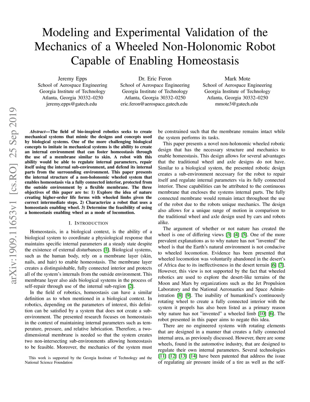 The field of bio-inspired robotics seeks to create mechanical systems that mimic the designs and concepts used by biological systems. One of the more challenging biological concepts to imitate in mechanical systems is the ability to create an internal environment that can foster homeostasis through the use of a membrane similar to skin. A robot with this ability would be able to regulate internal parameters, repair itself using the internal sub-environment, and defend its internal parts from the surrounding environment. This paper presents the internal structure of a non-holonomic wheeled system that enables homeostasis via a fully connected interior, protected from the outside environment by a flexible membrane. The three objectives of this paper are to: 1) Explore the idea of nature creating higher-order life forms with wheeled limbs given the correct intermediate steps. 2) Characterize a robot that uses a homeostasis enabling wheel. 3) Determine the feasibility of using a homeostasis enabling wheel as a mode of locomotion.