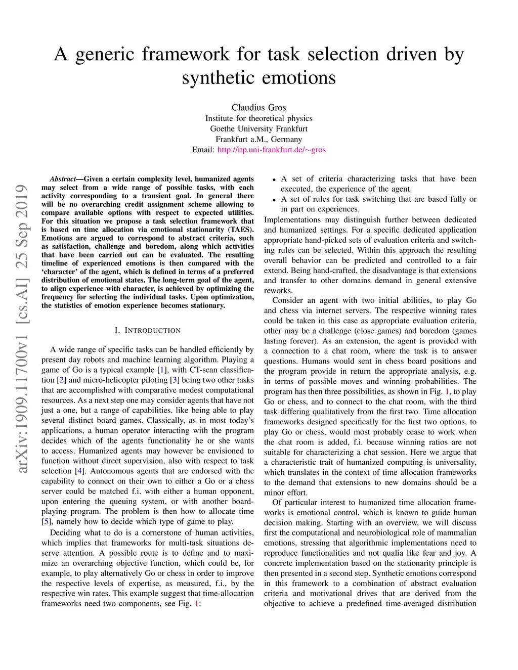 Given a certain complexity level, humanized agents may select from a wide range of possible tasks, with each activity corresponding to a transient goal. In general there will be no overarching credit assignment scheme allowing to compare available options with respect to expected utilities. For this situation we propose a task selection framework that is based on time allocation via emotional stationarity (TAES). Emotions are argued to correspond to abstract criteria, such as satisfaction, challenge and boredom, along which activities that have been carried out can be evaluated. The resulting timeline of experienced emotions is then compared with the `character' of the agent, which is defined in terms of a preferred distribution of emotional states. The long-term goal of the agent, to align experience with character, is achieved by optimizing the frequency for selecting the individual tasks. Upon optimization, the statistics of emotion experience becomes stationary.