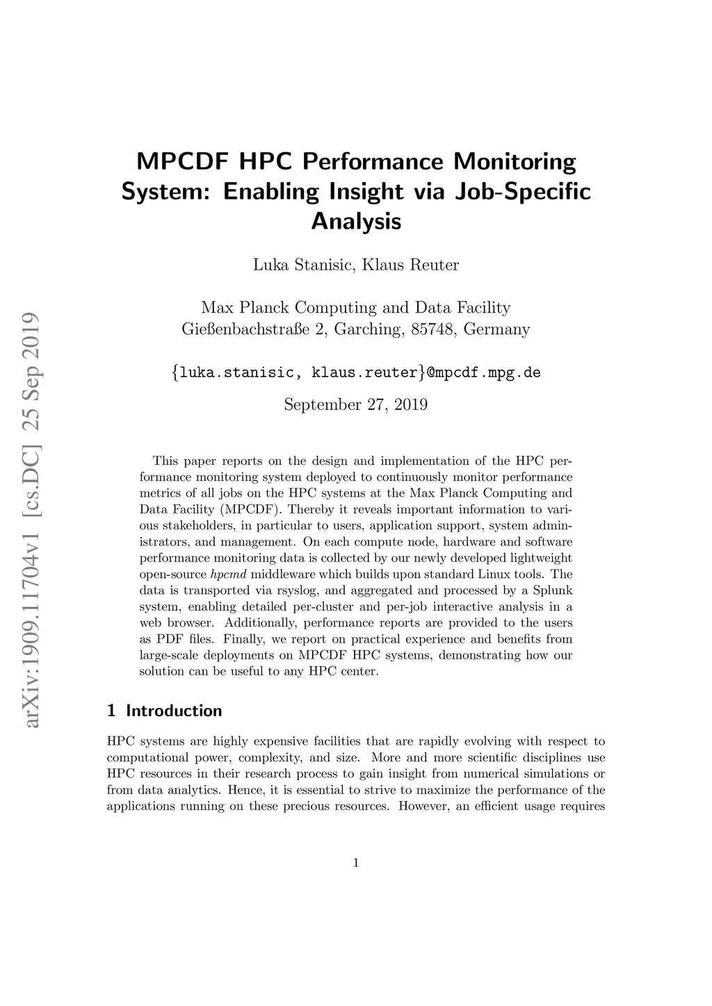 This paper reports on the design and implementation of the HPC performance monitoring system deployed to continuously monitor performance metrics of all jobs on the HPC systems at the Max Planck Computing and Data Facility (MPCDF). Thereby it reveals important information to various stakeholders, in particular to users, application support, system administrators, and management. On each compute node, hardware and software performance monitoring data is collected by our newly developed lightweight open-source hpcmd middleware which builds upon standard Linux tools. The data is transported via rsyslog, and aggregated and processed by a Splunk system, enabling detailed per-cluster and per-job interactive analysis in a web browser. Additionally, performance reports are provided to the users as PDF files. Finally, we report on practical experience and benefits from large-scale deployments on MPCDF HPC systems, demonstrating how our solution can be useful to any HPC center.