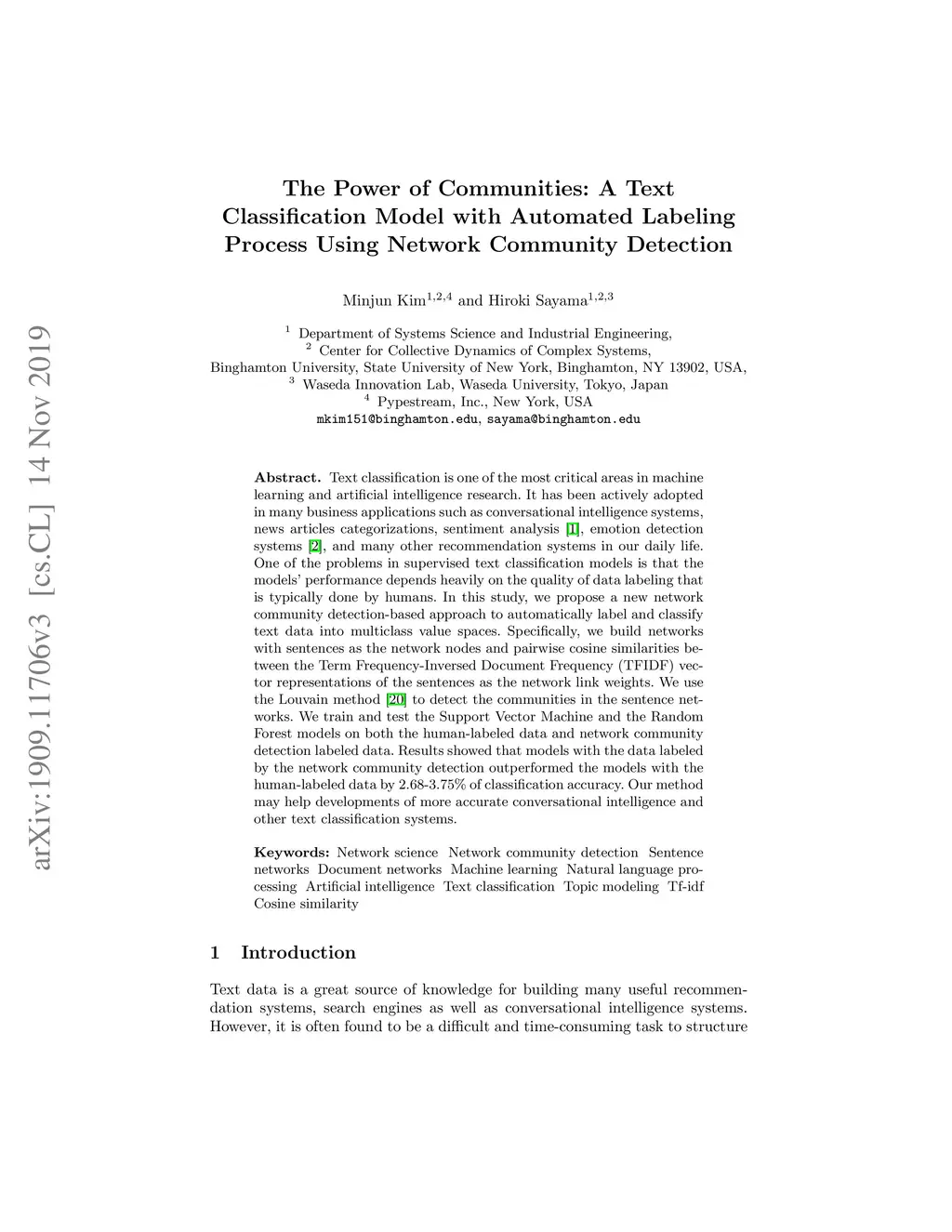 Text classification is one of the most critical areas in machine learning and artificial intelligence research. It has been actively adopted in many business applications such as conversational intelligence systems, news articles categorizations, sentiment analysis, emotion detection systems, and many other recommendation systems in our daily life. One of the problems in supervised text classification models is that the models' performance depends heavily on the quality of data labeling that is typically done by humans. In this study, we propose a new network community detection-based approach to automatically label and classify text data into multiclass value spaces. Specifically, we build networks with sentences as the network nodes and pairwise cosine similarities between the Term Frequency-Inversed Document Frequency (TFIDF) vector representations of the sentences as the network link weights. We use the Louvain method to detect the communities in the sentence networks. We train and test the Support Vector Machine and the Random Forest models on both the human-labeled data and network community detection labeled data. Results showed that models with the data labeled by the network community detection outperformed the models with the human-labeled data by 2.68-3.75% of classification accuracy. Our method may help developments of more accurate conversational intelligence and other text classification systems.
