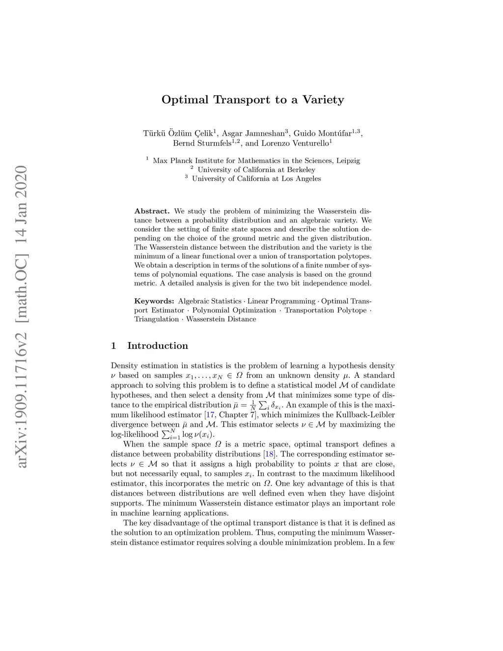 We study the problem of minimizing the Wasserstein distance between a probability distribution and an algebraic variety. We consider the setting of finite state spaces and describe the solution depending on the choice of the ground metric and the given distribution. The Wasserstein distance between the distribution and the variety is the minimum of a linear functional over a union of transportation polytopes. We obtain a description in terms of the solutions of a finite number of systems of polynomial equations. The case analysis is based on the ground metric. A detailed analysis is given for the two bit independence model.