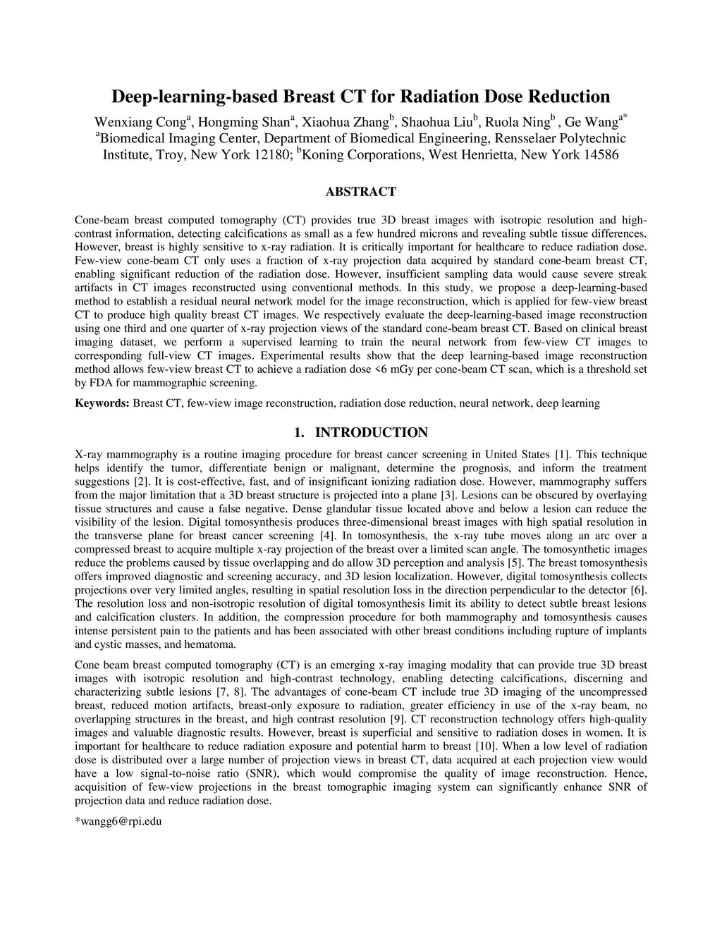 Deep-learning-based Breast CT for Radiation Dose Reduction
