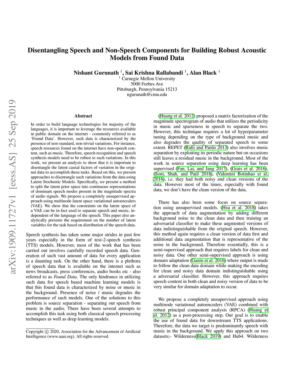 In order to build language technologies for majority of the languages, it is important to leverage the resources available in public domain on the internet - commonly referred to as `Found Data'. However, such data is characterized by the presence of non-standard, non-trivial variations. For instance, speech resources found on the internet have non-speech content, such as music. Therefore, speech recognition and speech synthesis models need to be robust to such variations. In this work, we present an analysis to show that it is important to disentangle the latent causal factors of variation in the original data to accomplish these tasks. Based on this, we present approaches to disentangle such variations from the data using Latent Stochastic Models. Specifically, we present a method to split the latent prior space into continuous representations of dominant speech modes present in the magnitude spectra of audio signals. We propose a completely unsupervised approach using multinode latent space variational autoencoders (VAE). We show that the constraints on the latent space of a VAE can be in-fact used to separate speech and music, independent of the language of the speech. This paper also analytically presents the requirement on the number of latent variables for the task based on distribution of the speech data.