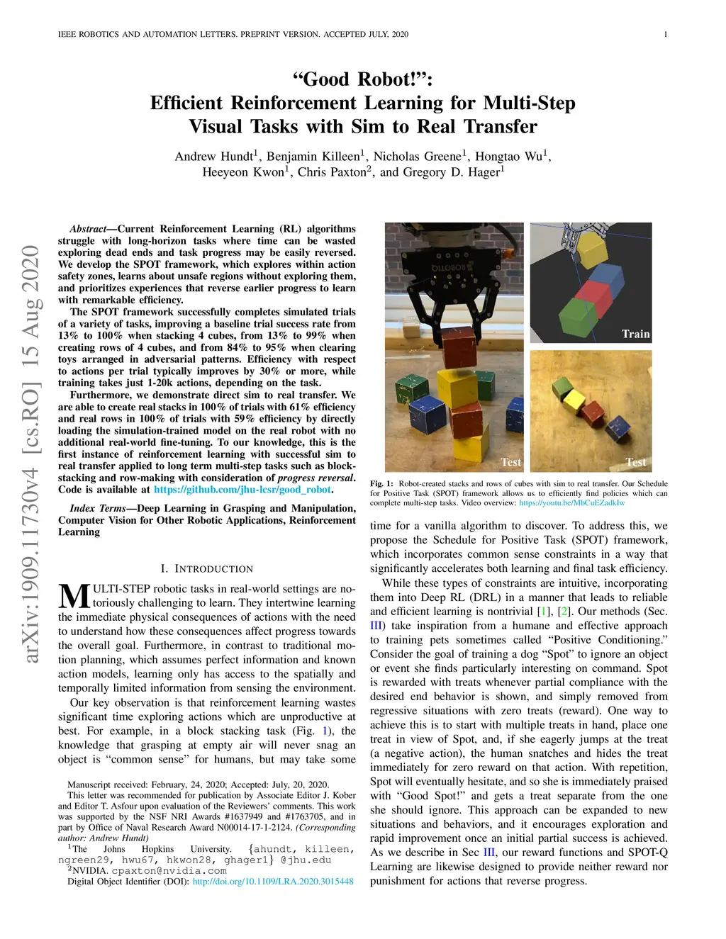 Current Reinforcement Learning (RL) algorithms struggle with long-horizon tasks where time can be wasted exploring dead ends and task progress may be easily reversed. We develop the SPOT framework, which explores within action safety zones, learns about unsafe regions without exploring them, and prioritizes experiences that reverse earlier progress to learn with remarkable efficiency. The SPOT framework successfully completes simulated trials of a variety of tasks, improving a baseline trial success rate from 13% to 100% when stacking 4 cubes, from 13% to 99% when creating rows of 4 cubes, and from 84% to 95% when clearing toys arranged in adversarial patterns. Efficiency with respect to actions per trial typically improves by 30% or more, while training takes just 1-20k actions, depending on the task. Furthermore, we demonstrate direct sim to real transfer. We are able to create real stacks in 100% of trials with 61% efficiency and real rows in 100% of trials with 59% efficiency by directly loading the simulation-trained model on the real robot with no additional real-world fine-tuning. To our knowledge, this is the first instance of reinforcement learning with successful sim to real transfer applied to long term multi-step tasks such as block-stacking and row-making with consideration of progress reversal. Code is available at https://github.com/jhu-lcsr/good_robot .
