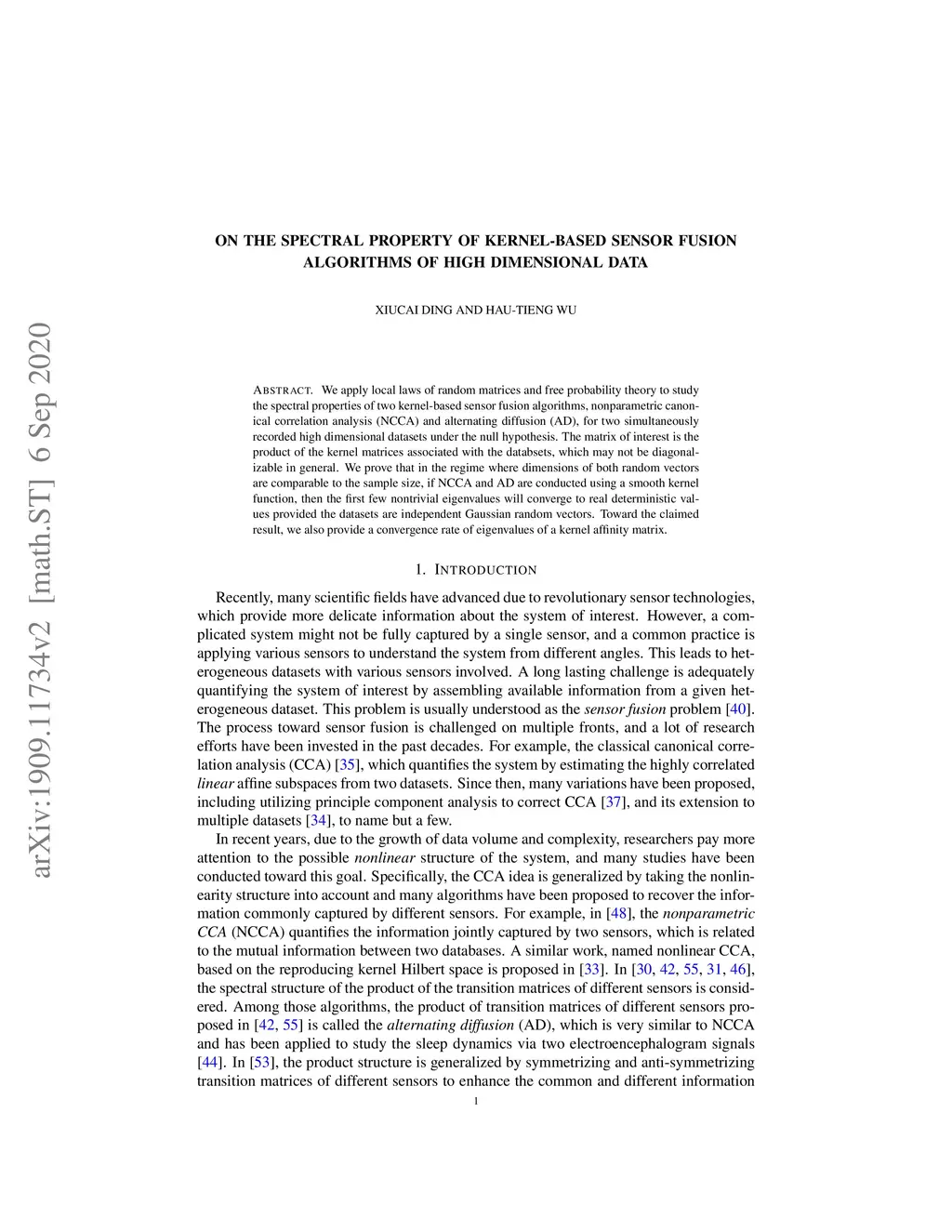 We apply local laws of random matrices and free probability theory to study the spectral properties of two kernel-based sensor fusion algorithms, nonparametric canonical correlation analysis (NCCA) and alternating diffusion (AD), for two simultaneously recorded high dimensional datasets under the null hypothesis. The matrix of interest is the product of the kernel matrices associated with the databsets, which may not be diagonalizable in general. We prove that in the regime where dimensions of both random vectors are comparable to the sample size, if NCCA and AD are conducted using a smooth kernel function, then the first few nontrivial eigenvalues will converge to real deterministic values provided the datasets are independent Gaussian random vectors. Toward the claimed result, we also provide a convergence rate of eigenvalues of a kernel affinity matrix.