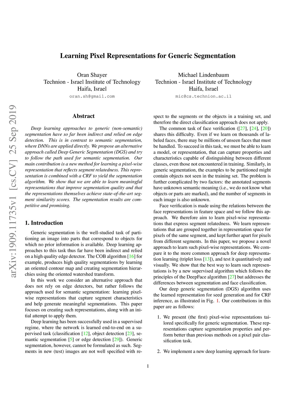 Deep learning approaches to generic (non-semantic) segmentation have so far been indirect and relied on edge detection. This is in contrast to semantic segmentation, where DNNs are applied directly. We propose an alternative approach called Deep Generic Segmentation (DGS) and try to follow the path used for semantic segmentation. Our main contribution is a new method for learning a pixel-wise representation that reflects segment relatedness. This representation is combined with a CRF to yield the segmentation algorithm. We show that we are able to learn meaningful representations that improve segmentation quality and that the representations themselves achieve state-of-the-art segment similarity scores. The segmentation results are competitive and promising.