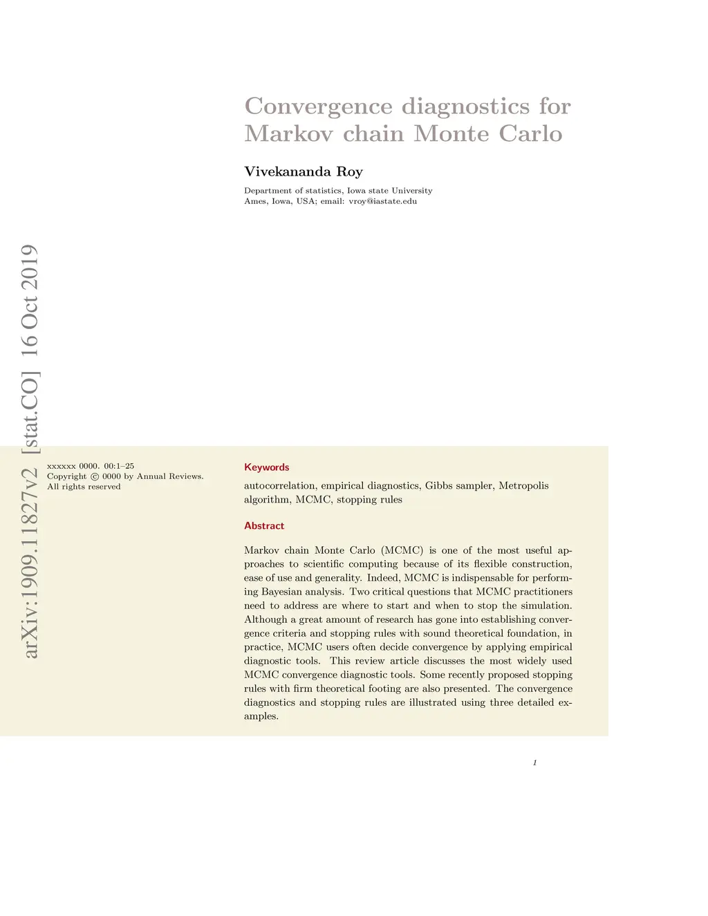 Markov chain Monte Carlo (MCMC) is one of the most useful approaches to scientific computing because of its flexible construction, ease of use and generality. Indeed, MCMC is indispensable for performing Bayesian analysis. Two critical questions that MCMC practitioners need to address are where to start and when to stop the simulation. Although a great amount of research has gone into establishing convergence criteria and stopping rules with sound theoretical foundation, in practice, MCMC users often decide convergence by applying empirical diagnostic tools. This review article discusses the most widely used MCMC convergence diagnostic tools. Some recently proposed stopping rules with firm theoretical footing are also presented. The convergence diagnostics and stopping rules are illustrated using three detailed examples.
