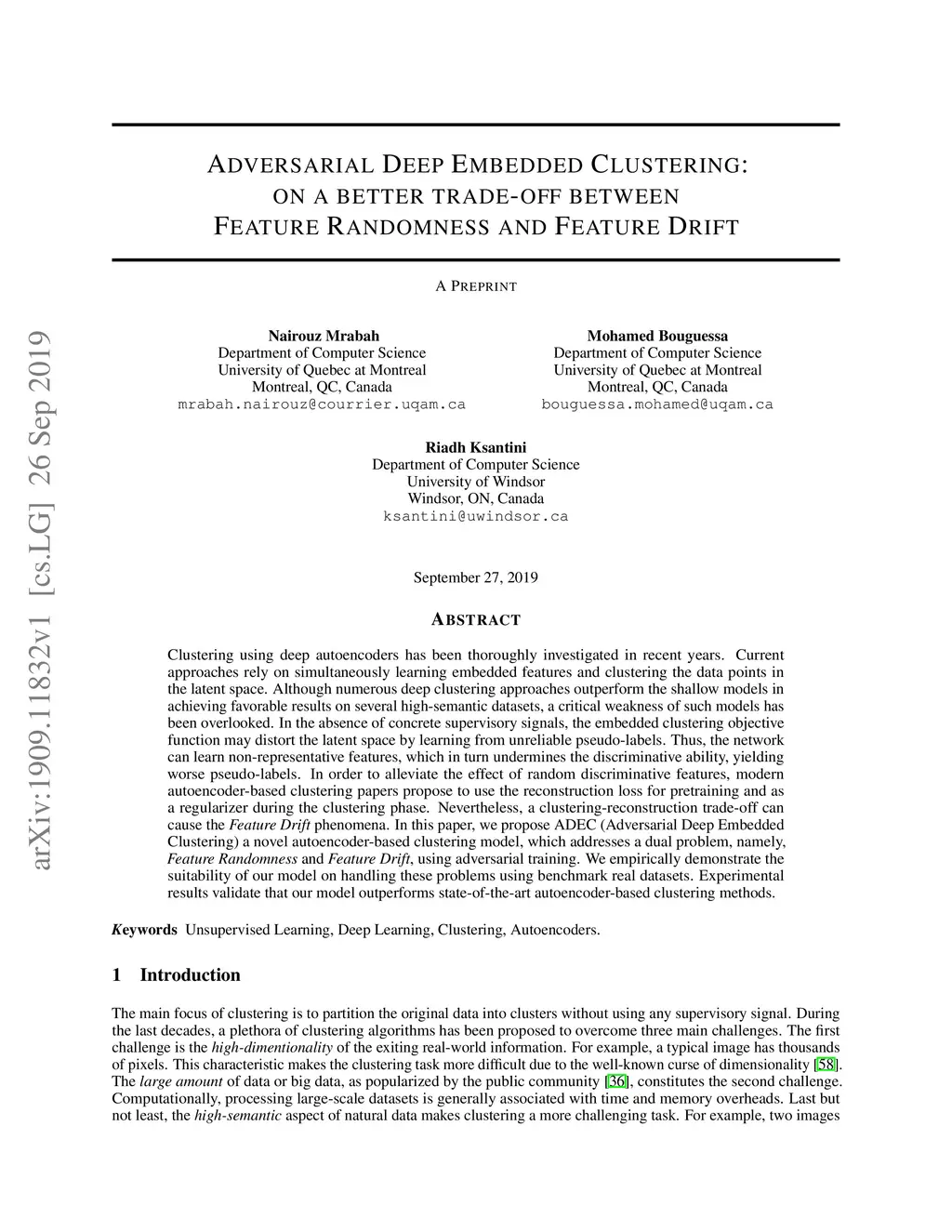 Clustering using deep autoencoders has been thoroughly investigated in recent years. Current approaches rely on simultaneously learning embedded features and clustering the data points in the latent space. Although numerous deep clustering approaches outperform the shallow models in achieving favorable results on several high-semantic datasets, a critical weakness of such models has been overlooked. In the absence of concrete supervisory signals, the embedded clustering objective function may distort the latent space by learning from unreliable pseudo-labels. Thus, the network can learn non-representative features, which in turn undermines the discriminative ability, yielding worse pseudo-labels. In order to alleviate the effect of random discriminative features, modern autoencoder-based clustering papers propose to use the reconstruction loss for pretraining and as a regularizer during the clustering phase. Nevertheless, a clustering-reconstruction trade-off can cause the \textit{Feature Drift} phenomena. In this paper, we propose ADEC (Adversarial Deep Embedded Clustering) a novel autoencoder-based clustering model, which addresses a dual problem, namely, \textit{Feature Randomness} and \textit{Feature Drift}, using adversarial training. We empirically demonstrate the suitability of our model on handling these problems using benchmark real datasets. Experimental results validate that our model outperforms state-of-the-art autoencoder-based clustering methods.