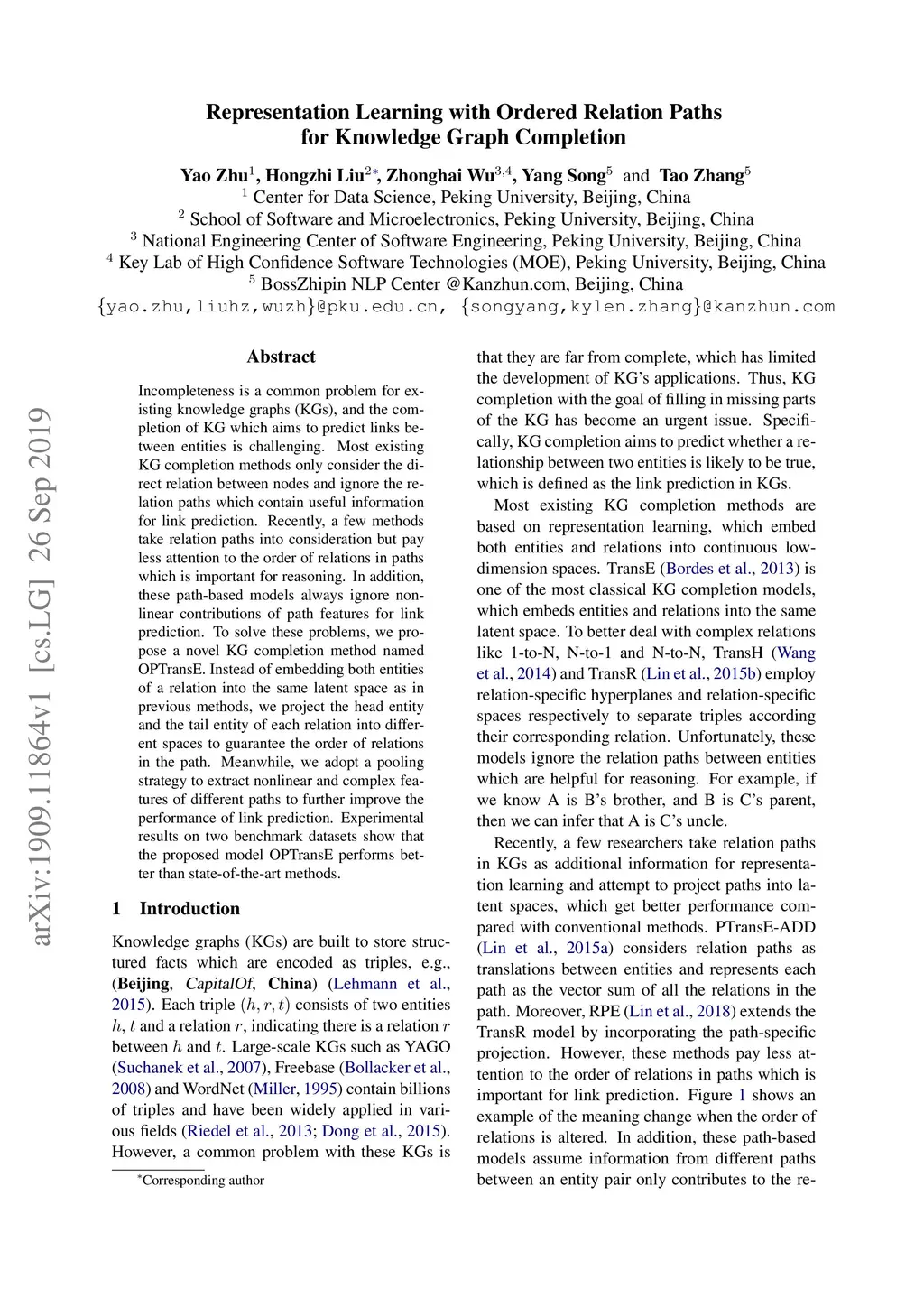 Representation Learning with Ordered Relation Paths for Knowledge Graph