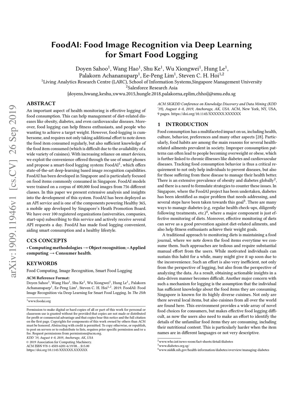 An important aspect of health monitoring is effective logging of food consumption. This can help management of diet-related diseases like obesity, diabetes, and even cardiovascular diseases. Moreover, food logging can help fitness enthusiasts, and people who wanting to achieve a target weight. However, food-logging is cumbersome, and requires not only taking additional effort to note down the food item consumed regularly, but also sufficient knowledge of the food item consumed (which is difficult due to the availability of a wide variety of cuisines). With increasing reliance on smart devices, we exploit the convenience offered through the use of smart phones and propose a smart-food logging system: FoodAI, which offers state-of-the-art deep-learning based image recognition capabilities. FoodAI has been developed in Singapore and is particularly focused on food items commonly consumed in Singapore. FoodAI models were trained on a corpus of 400,000 food images from 756 different classes. In this paper we present extensive analysis and insights into the development of this system. FoodAI has been deployed as an API service and is one of the components powering Healthy 365, a mobile app developed by Singapore's Heath Promotion Board. We have over 100 registered organizations (universities, companies, start-ups) subscribing to this service and actively receive several API requests a day. FoodAI has made food logging convenient, aiding smart consumption and a healthy lifestyle.