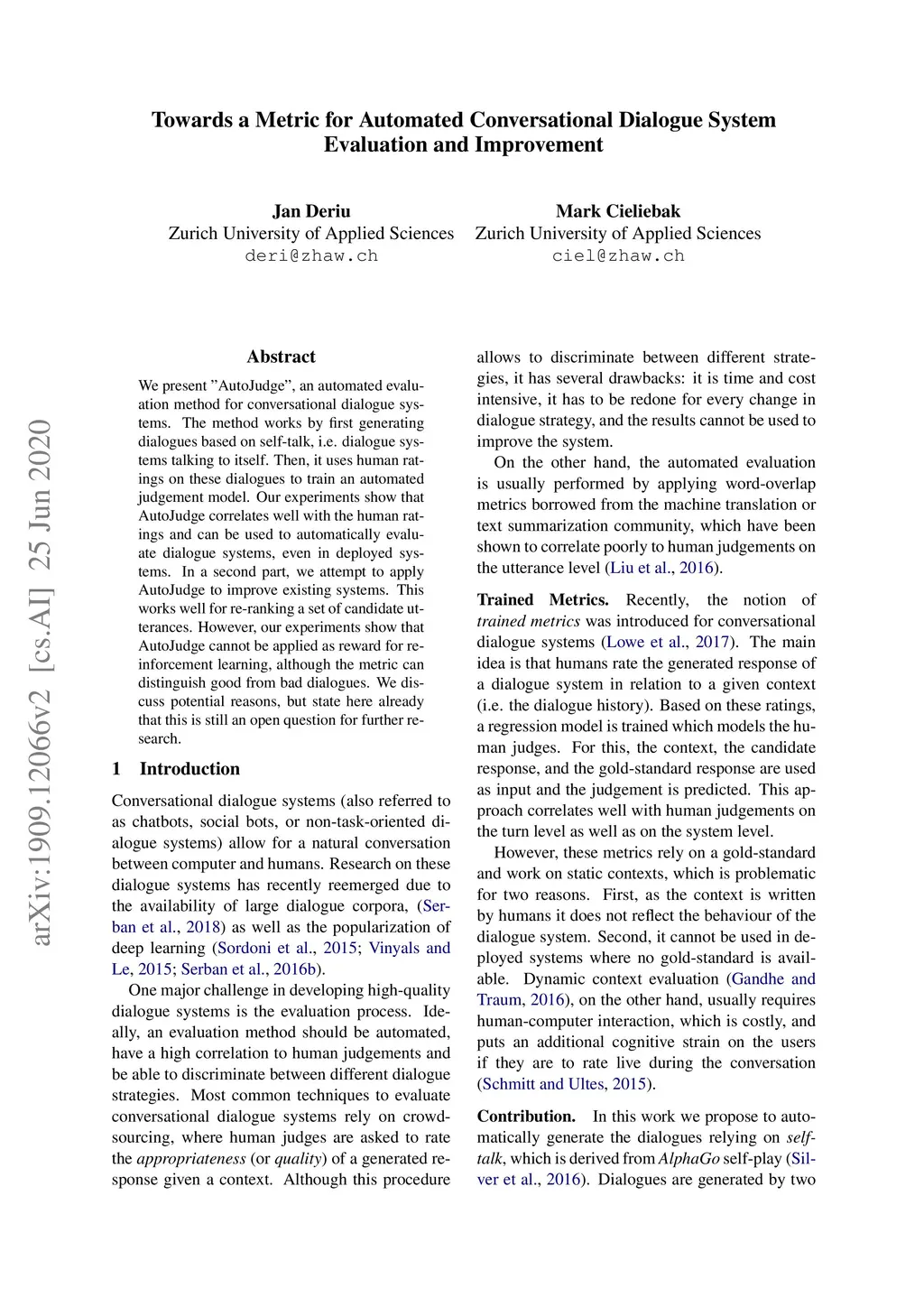 We present "AutoJudge", an automated evaluation method for conversational dialogue systems. The method works by first generating dialogues based on self-talk, i.e. dialogue systems talking to itself. Then, it uses human ratings on these dialogues to train an automated judgement model. Our experiments show that AutoJudge correlates well with the human ratings and can be used to automatically evaluate dialogue systems, even in deployed systems. In a second part, we attempt to apply AutoJudge to improve existing systems. This works well for re-ranking a set of candidate utterances. However, our experiments show that AutoJudge cannot be applied as reward for reinforcement learning, although the metric can distinguish good from bad dialogues. We discuss potential reasons, but state here already that this is still an open question for further research.
