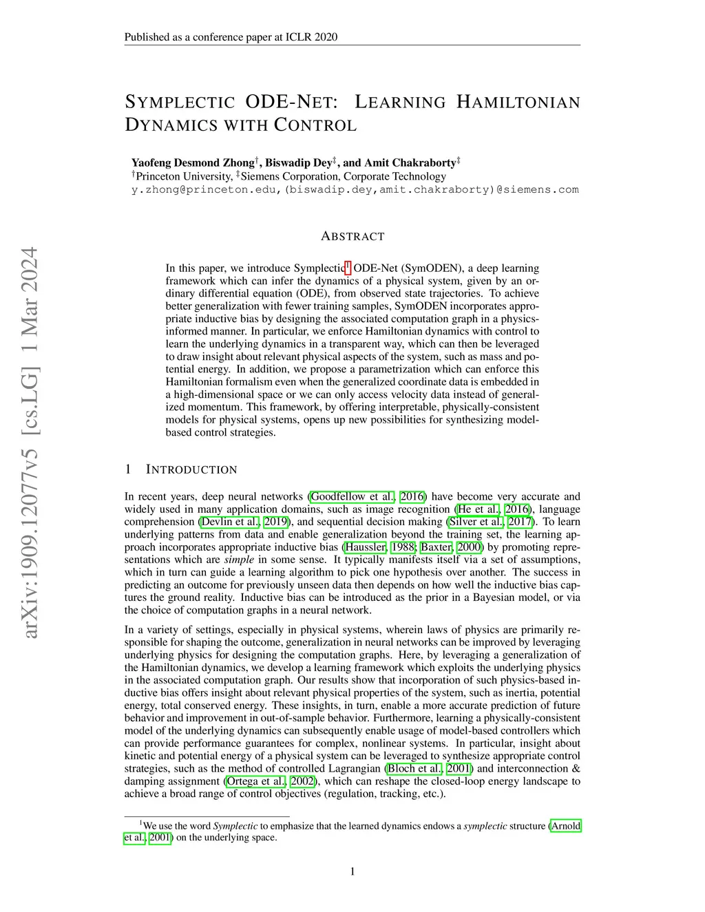 In this paper, we introduce Symplectic ODE-Net (SymODEN), a deep learning framework which can infer the dynamics of a physical system, given by an ordinary differential equation (ODE), from observed state trajectories. To achieve better generalization with fewer training samples, SymODEN incorporates appropriate inductive bias by designing the associated computation graph in a physics-informed manner. In particular, we enforce Hamiltonian dynamics with control to learn the underlying dynamics in a transparent way, which can then be leveraged to draw insight about relevant physical aspects of the system, such as mass and potential energy. In addition, we propose a parametrization which can enforce this Hamiltonian formalism even when the generalized coordinate data is embedded in a high-dimensional space or we can only access velocity data instead of generalized momentum. This framework, by offering interpretable, physically-consistent models for physical systems, opens up new possibilities for synthesizing model-based control strategies.