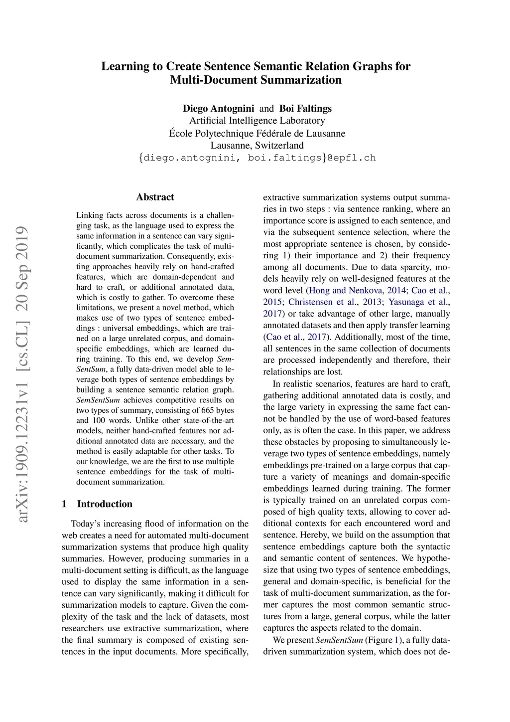 Linking facts across documents is a challenging task, as the language used to express the same information in a sentence can vary significantly, which complicates the task of multi-document summarization. Consequently, existing approaches heavily rely on hand-crafted features, which are domain-dependent and hard to craft, or additional annotated data, which is costly to gather. To overcome these limitations, we present a novel method, which makes use of two types of sentence embeddings: universal embeddings, which are trained on a large unrelated corpus, and domain-specific embeddings, which are learned during training. To this end, we develop SemSentSum, a fully data-driven model able to leverage both types of sentence embeddings by building a sentence semantic relation graph. SemSentSum achieves competitive results on two types of summary, consisting of 665 bytes and 100 words. Unlike other state-of-the-art models, neither hand-crafted features nor additional annotated data are necessary, and the method is easily adaptable for other tasks. To our knowledge, we are the first to use multiple sentence embeddings for the task of multi-document summarization.