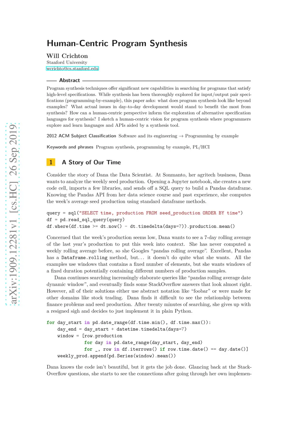 Program synthesis techniques offer significant new capabilities in searching for programs that satisfy high-level specifications. While synthesis has been thoroughly explored for input/output pair specifications (programming-by-example), this paper asks: what does program synthesis look like beyond examples? What actual issues in day-to-day development would stand to benefit the most from synthesis? How can a human-centric perspective inform the exploration of alternative specification languages for synthesis? I sketch a human-centric vision for program synthesis where programmers explore and learn languages and APIs aided by a synthesis tool.