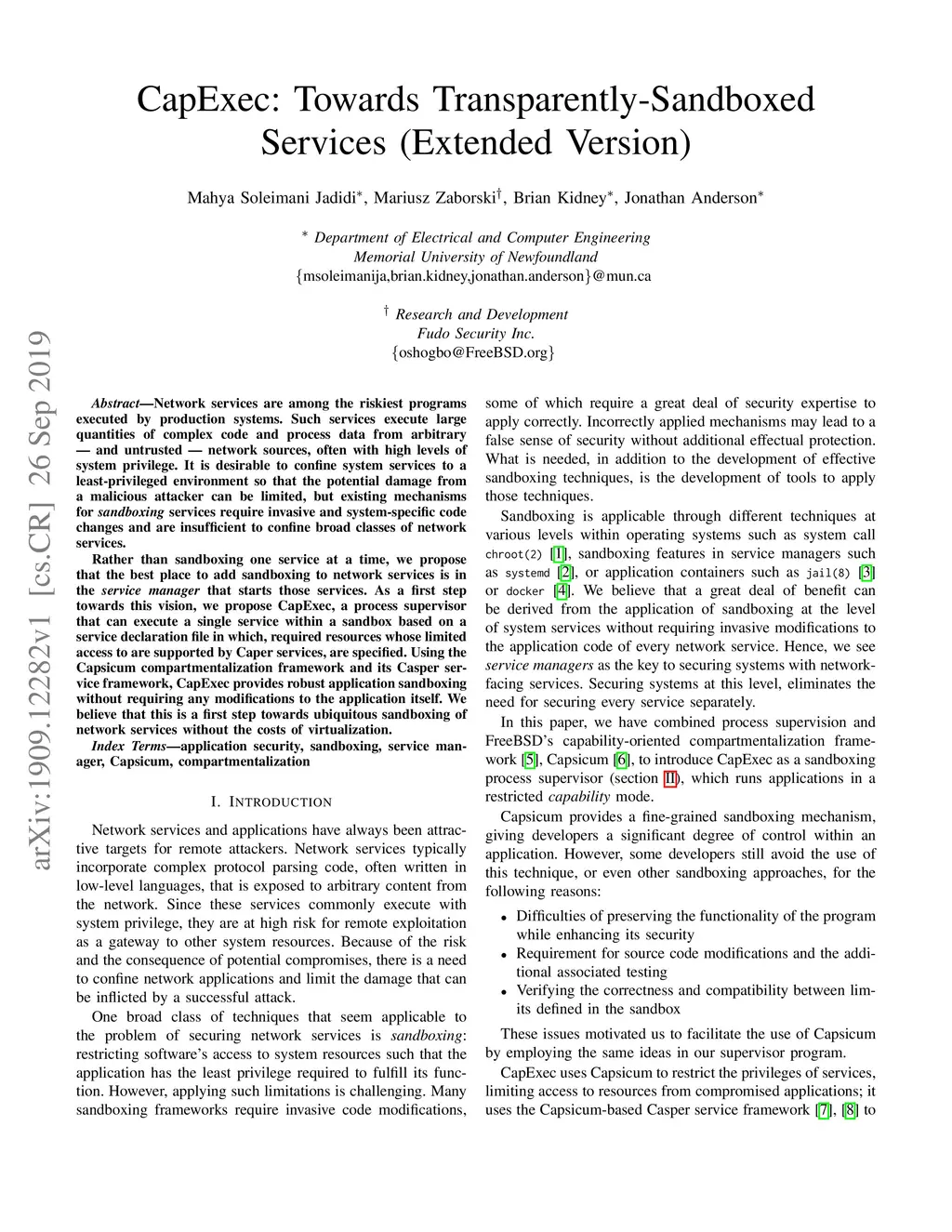 Network services are among the riskiest programs executed by production systems. Such services execute large quantities of complex code and process data from arbitrary and untrusted network sources, often with high levels of system privilege. It is desirable to confine system services to a least-privileged environment so that the potential damage from a malicious attacker can be limited, but existing mechanisms for sandboxing services require invasive and system-specific code changes and are insufficient to confine broad classes of network services. Rather than sandboxing one service at a time, we propose that the best place to add sandboxing to network services is in the service manager that starts those services. As a first step towards this vision, we propose CapExec, a process supervisor that can execute a single service within a sandbox based on a service declaration file in which, required resources whose limited access to are supported by Caper services, are specified. Using the Capsicum compartmentalization framework and its Casper service framework, CapExec provides robust application sandboxing without requiring any modifications to the application itself. We believe that this is a first step towards ubiquitous sandboxing of network services without the costs of virtualization. Keywords: application security, sandboxing, service manager, Capsicum, compartmentalization