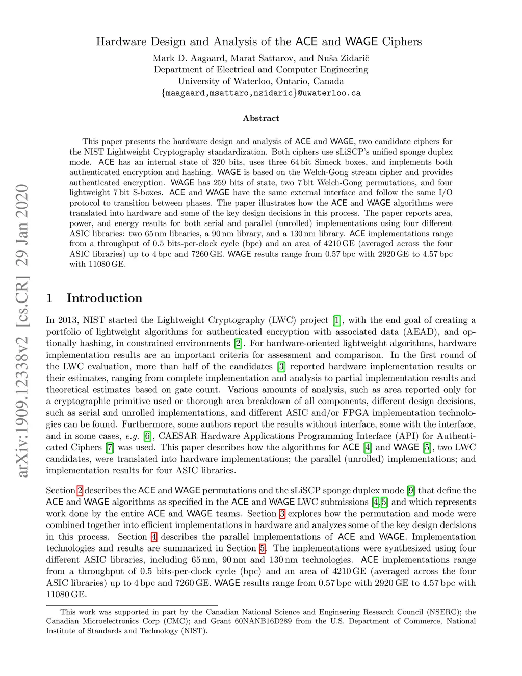 This paper presents the hardware design and analysis of ACE and WAGE, two candidate ciphers for the NIST Lightweight Cryptography standardization. Both ciphers use sLiSCP's unified sponge duplex mode. ACE has an internal state of 320 bits, uses three 64 bit Simeck boxes, and implements both authenticated encryption and hashing. WAGE is based on the Welch-Gong stream cipher and provides authenticated encryption. WAGE has 259 bits of state, two 7 bit Welch-Gong permutations, and four lightweight 7 bit S-boxes. ACE and WAGE have the same external interface and follow the same I/O protocol to transition between phases. The paper illustrates how a hardware perspective influenced key aspects of the ACE and WAGE algorithms. The paper reports area, power, and energy results for both serial and parallel (unrolled) implementations using four different ASIC libraries: two 65 nm libraries, a 90 nm library, and a 130 nm library. ACE implementations range from a throughput of 0.5 bits-per-clock cycle (bpc) and an area of 4210 GE (averaged across the four ASIC libraries) up to 4 bpc and 7260 GE. WAGE results range from 0.57 bpc with 2920 GE to 4.57 bpc with 11080 GE.