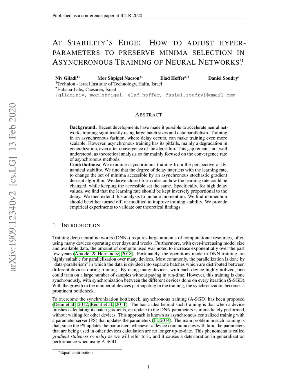 Background: Recent developments have made it possible to accelerate neural networks training significantly using large batch sizes and data parallelism. Training in an asynchronous fashion, where delay occurs, can make training even more scalable. However, asynchronous training has its pitfalls, mainly a degradation in generalization, even after convergence of the algorithm. This gap remains not well understood, as theoretical analysis so far mainly focused on the convergence rate of asynchronous methods. Contributions: We examine asynchronous training from the perspective of dynamical stability. We find that the degree of delay interacts with the learning rate, to change the set of minima accessible by an asynchronous stochastic gradient descent algorithm. We derive closed-form rules on how the learning rate could be changed, while keeping the accessible set the same. Specifically, for high delay values, we find that the learning rate should be kept inversely proportional to the delay. We then extend this analysis to include momentum. We find momentum should be either turned off, or modified to improve training stability. We provide empirical experiments to validate our theoretical findings.