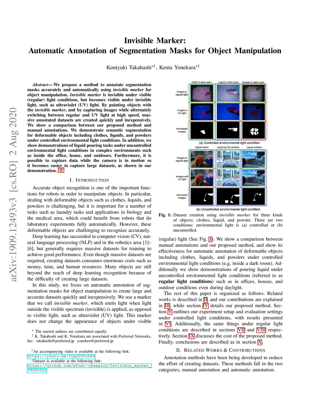 We propose a method to annotate segmentation masks accurately and automatically using invisible marker for object manipulation. Invisible marker is invisible under visible (regular) light conditions, but becomes visible under invisible light, such as ultraviolet (UV) light. By painting objects with the invisible marker, and by capturing images while alternately switching between regular and UV light at high speed, massive annotated datasets are created quickly and inexpensively. We show a comparison between our proposed method and manual annotations. We demonstrate semantic segmentation for deformable objects including clothes, liquids, and powders under controlled environmental light conditions. In addition, we show demonstrations of liquid pouring tasks under uncontrolled environmental light conditions in complex environments such as inside the office, house, and outdoors. Furthermore, it is possible to capture data while the camera is in motion so it becomes easier to capture large datasets, as shown in our demonstration.