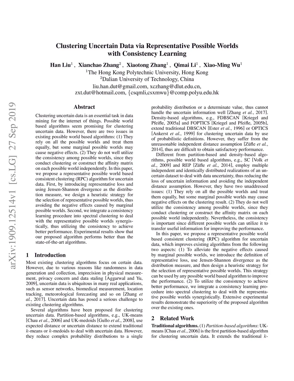 Clustering uncertain data is an essential task in data mining for the internet of things. Possible world based algorithms seem promising for clustering uncertain data. However, there are two issues in existing possible world based algorithms: (1) They rely on all the possible worlds and treat them equally, but some marginal possible worlds may cause negative effects. (2) They do not well utilize the consistency among possible worlds, since they conduct clustering or construct the affinity matrix on each possible world independently. In this paper, we propose a representative possible world based consistent clustering (RPC) algorithm for uncertain data. First, by introducing representative loss and using Jensen-Shannon divergence as the distribution measure, we design a heuristic strategy for the selection of representative possible worlds, thus avoiding the negative effects caused by marginal possible worlds. Second, we integrate a consistency learning procedure into spectral clustering to deal with the representative possible worlds synergistically, thus utilizing the consistency to achieve better performance. Experimental results show that our proposed algorithm performs better than the state-of-the-art algorithms.