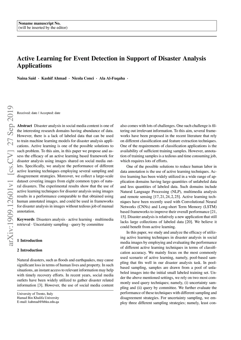 Disaster analysis in social media content is one of the interesting research domains having abundance of data. However, there is a lack of labeled data that can be used to train machine learning models for disaster analysis applications. Active learning is one of the possible solutions to such problem. To this aim, in this paper we propose and assess the efficacy of an active learning based framework for disaster analysis using images shared on social media outlets. Specifically, we analyze the performance of different active learning techniques employing several sampling and disagreement strategies. Moreover, we collect a large-scale dataset covering images from eight common types of natural disasters. The experimental results show that the use of active learning techniques for disaster analysis using images results in a performance comparable to that obtained using human annotated images, and could be used in frameworks for disaster analysis in images without tedious job of manual annotation.