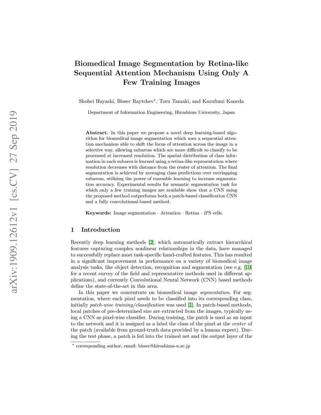 In this paper we propose a novel deep learning-based algorithm for biomedical image segmentation which uses a sequential attention mechanism able to shift the focus of attention across the image in a selective way, allowing subareas which are more difficult to classify to be processed at increased resolution. The spatial distribution of class information in each subarea is learned using a retina-like representation where resolution decreases with distance from the center of attention. The final segmentation is achieved by averaging class predictions over overlapping subareas, utilizing the power of ensemble learning to increase segmentation accuracy. Experimental results for semantic segmentation task for which only a few training images are available show that a CNN using the proposed method outperforms both a patch-based classification CNN and a fully convolutional-based method.
