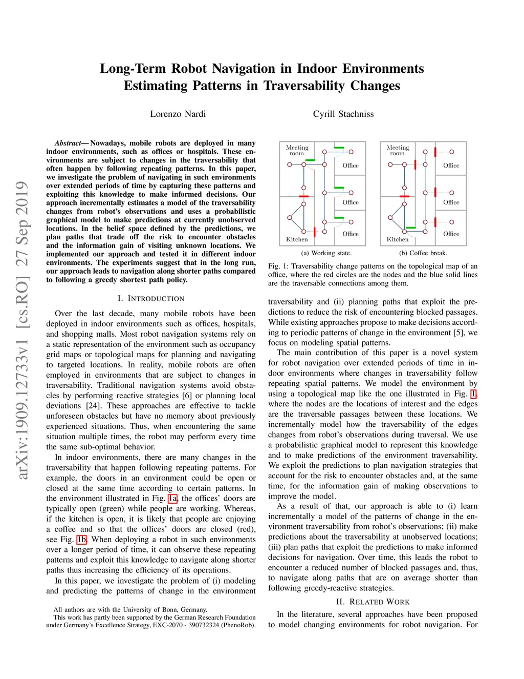 Nowadays, mobile robots are deployed in many indoor environments, such as offices or hospitals. These environments are subject to changes in the traversability that often happen by following repeating patterns. In this paper, we investigate the problem of navigating in such environments over extended periods of time by capturing these patterns and exploiting this knowledge to make informed decisions. Our approach incrementally estimates a model of the traversability changes from robot's observations and uses a probabilistic graphical model to make predictions at currently unobserved locations. In the belief space defined by the predictions, we plan paths that trade off the risk to encounter obstacles and the information gain of visiting unknown locations. We implemented our approach and tested it in different indoor environments. The experiments suggest that in the long run, our approach leads to navigation along shorter paths compared to following a greedy shortest path policy.
