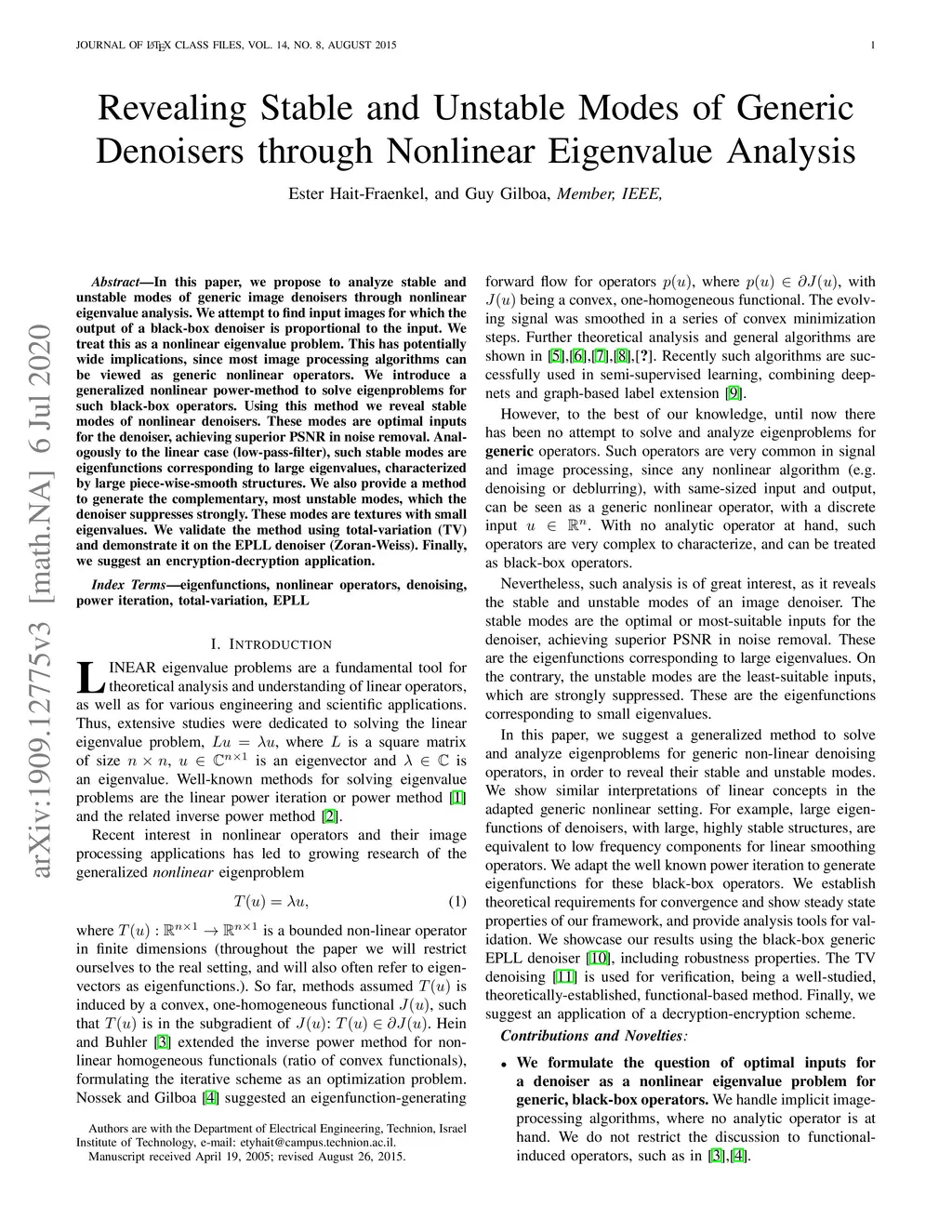 In this paper, we propose to analyze stable and unstable modes of generic image denoisers through nonlinear eigenvalue analysis. We attempt to find input images for which the output of a black-box denoiser is proportional to the input. We treat this as a nonlinear eigenvalue problem. This has potentially wide implications, since most image processing algorithms can be viewed as generic nonlinear operators. We introduce a generalized nonlinear power-method to solve eigenproblems for such black-box operators. Using this method we reveal stable modes of nonlinear denoisers. These modes are optimal inputs for the denoiser, achieving superior PSNR in noise removal. Analogously to the linear case (low-pass-filter), such stable modes are eigenfunctions corresponding to large eigenvalues, characterized by large piece-wise-smooth structures. We also provide a method to generate the complementary, most unstable modes, which the denoiser suppresses strongly. These modes are textures with small eigenvalues. We validate the method using total-variation (TV) and demonstrate it on the EPLL denoiser (Zoran-Weiss). Finally, we suggest an encryption-decryption application.