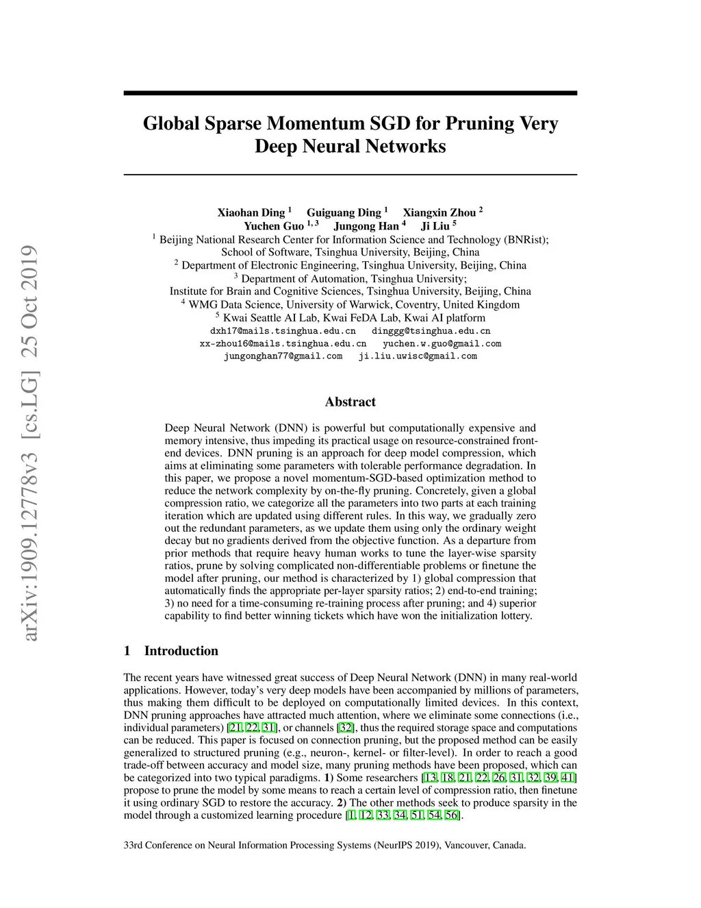Global Sparse Momentum SGD for Pruning Very Deep Neural Networks