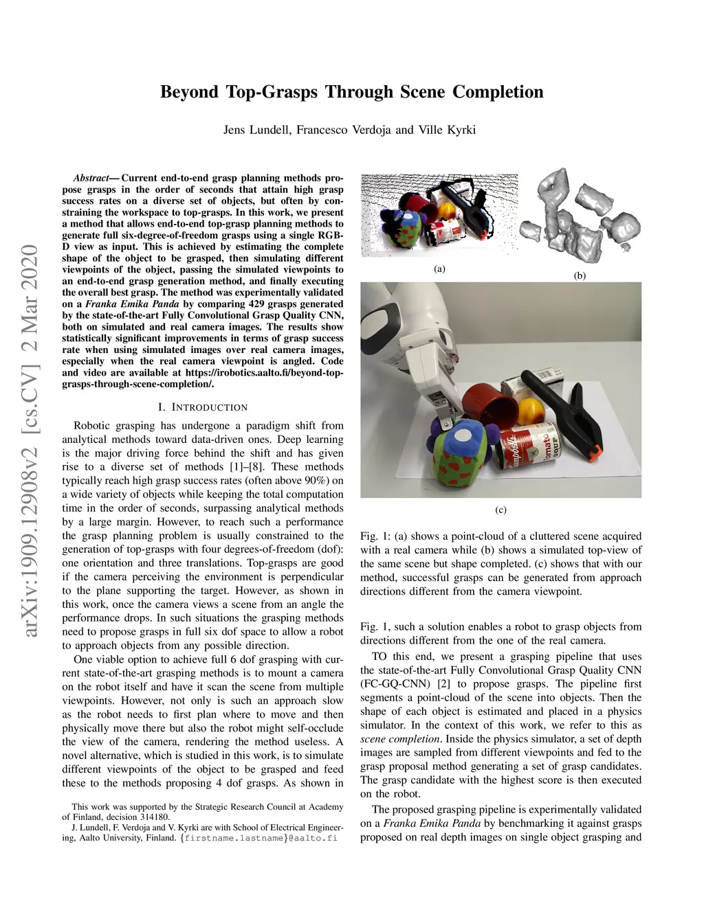 Current end-to-end grasp planning methods propose grasps in the order of seconds that attain high grasp success rates on a diverse set of objects, but often by constraining the workspace to top-grasps. In this work, we present a method that allows end-to-end top-grasp planning methods to generate full six-degree-of-freedom grasps using a single RGB-D view as input. This is achieved by estimating the complete shape of the object to be grasped, then simulating different viewpoints of the object, passing the simulated viewpoints to an end-to-end grasp generation method, and finally executing the overall best grasp. The method was experimentally validated on a Franka Emika Panda by comparing 429 grasps generated by the state-of-the-art Fully Convolutional Grasp Quality CNN, both on simulated and real camera images. The results show statistically significant improvements in terms of grasp success rate when using simulated images over real camera images, especially when the real camera viewpoint is angled. Code and video are available at https://irobotics.aalto.fi/beyond-top-grasps-through-scene-completion/.
