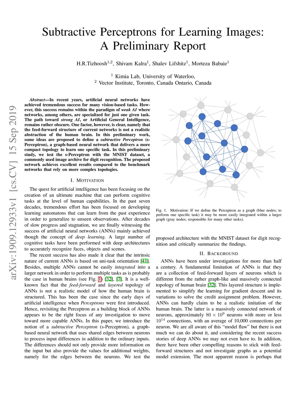 In recent years, artificial neural networks have achieved tremendous success for many vision-based tasks. However, this success remains within the paradigm of \emph{weak AI} where networks, among others, are specialized for just one given task. The path toward \emph{strong AI}, or Artificial General Intelligence, remains rather obscure. One factor, however, is clear, namely that the feed-forward structure of current networks is not a realistic abstraction of the human brain. In this preliminary work, some ideas are proposed to define a \textit{subtractive Perceptron} (s-Perceptron), a graph-based neural network that delivers a more compact topology to learn one specific task. In this preliminary study, we test the s-Perceptron with the MNIST dataset, a commonly used image archive for digit recognition. The proposed network achieves excellent results compared to the benchmark networks that rely on more complex topologies.