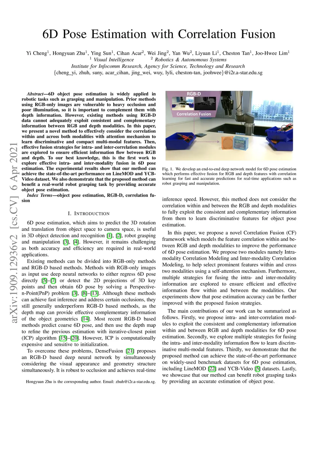 6D object pose estimation is widely applied in robotic tasks such as grasping and manipulation. Prior methods using RGB-only images are vulnerable to heavy occlusion and poor illumination, so it is important to complement them with depth information. However, existing methods using RGB-D data cannot adequately exploit consistent and complementary information between RGB and depth modalities. In this paper, we present a novel method to effectively consider the correlation within and across both modalities with attention mechanism to learn discriminative and compact multi-modal features. Then, effective fusion strategies for intra- and inter-correlation modules are explored to ensure efficient information flow between RGB and depth. To our best knowledge, this is the first work to explore effective intra- and inter-modality fusion in 6D pose estimation. The experimental results show that our method can achieve the state-of-the-art performance on LineMOD and YCB-Video dataset. We also demonstrate that the proposed method can benefit a real-world robot grasping task by providing accurate object pose estimation.