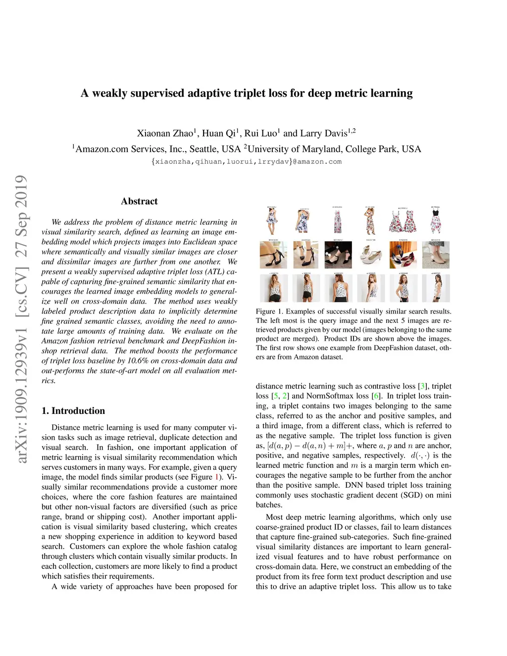 We address the problem of distance metric learning in visual similarity search, defined as learning an image embedding model which projects images into Euclidean space where semantically and visually similar images are closer and dissimilar images are further from one another. We present a weakly supervised adaptive triplet loss (ATL) capable of capturing fine-grained semantic similarity that encourages the learned image embedding models to generalize well on cross-domain data. The method uses weakly labeled product description data to implicitly determine fine grained semantic classes, avoiding the need to annotate large amounts of training data. We evaluate on the Amazon fashion retrieval benchmark and DeepFashion in-shop retrieval data. The method boosts the performance of triplet loss baseline by 10.6% on cross-domain data and out-performs the state-of-art model on all evaluation metrics.