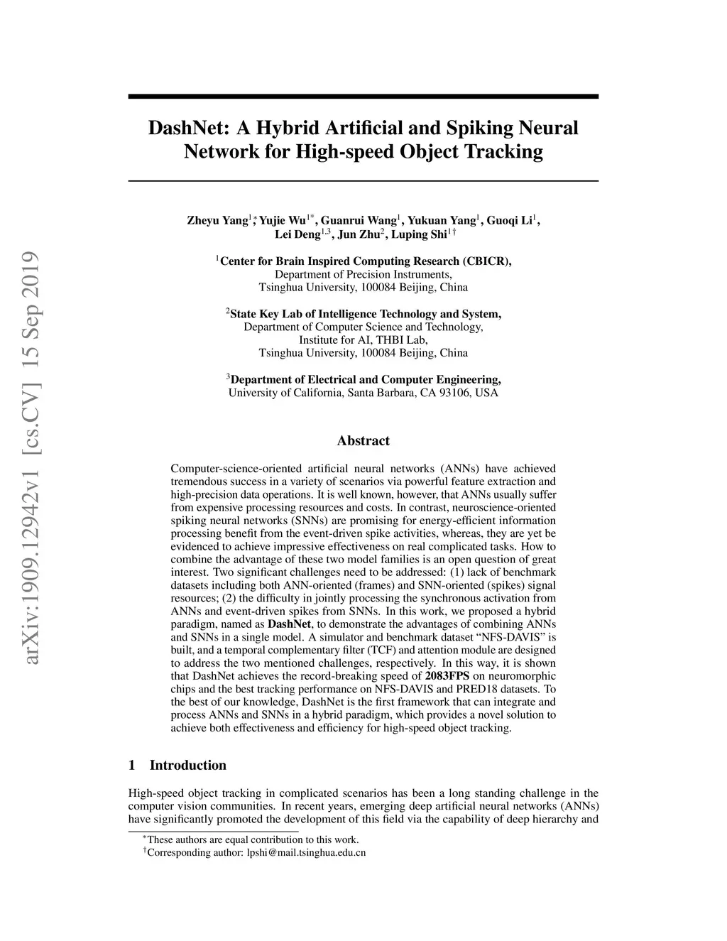 Computer-science-oriented artificial neural networks (ANNs) have achieved tremendous success in a variety of scenarios via powerful feature extraction and high-precision data operations. It is well known, however, that ANNs usually suffer from expensive processing resources and costs. In contrast, neuroscience-oriented spiking neural networks (SNNs) are promising for energy-efficient information processing benefit from the event-driven spike activities, whereas, they are yet be evidenced to achieve impressive effectiveness on real complicated tasks. How to combine the advantage of these two model families is an open question of great interest. Two significant challenges need to be addressed: (1) lack of benchmark datasets including both ANN-oriented (frames) and SNN-oriented (spikes) signal resources; (2) the difficulty in jointly processing the synchronous activation from ANNs and event-driven spikes from SNNs. In this work, we proposed a hybrid paradigm, named as DashNet, to demonstrate the advantages of combining ANNs and SNNs in a single model. A simulator and benchmark dataset NFS-DAVIS is built, and a temporal complementary filter (TCF) and attention module are designed to address the two mentioned challenges, respectively. In this way, it is shown that DashNet achieves the record-breaking speed of 2083FPS on neuromorphic chips and the best tracking performance on NFS-DAVIS and PRED18 datasets. To the best of our knowledge, DashNet is the first framework that can integrate and process ANNs and SNNs in a hybrid paradigm, which provides a novel solution to achieve both effectiveness and efficiency for high-speed object tracking.